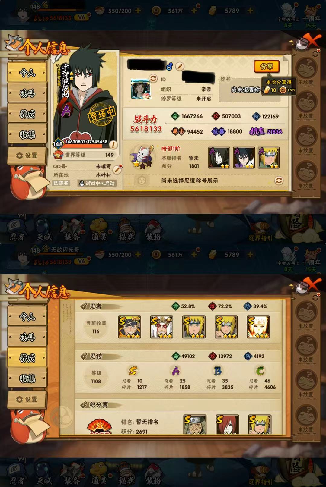15S忍/25A忍/战力933W/V8/区服3277【S忍者】宇智波止水「须佐能乎」,艾「忍界大战」,宇智波斑「秽土转生·解」