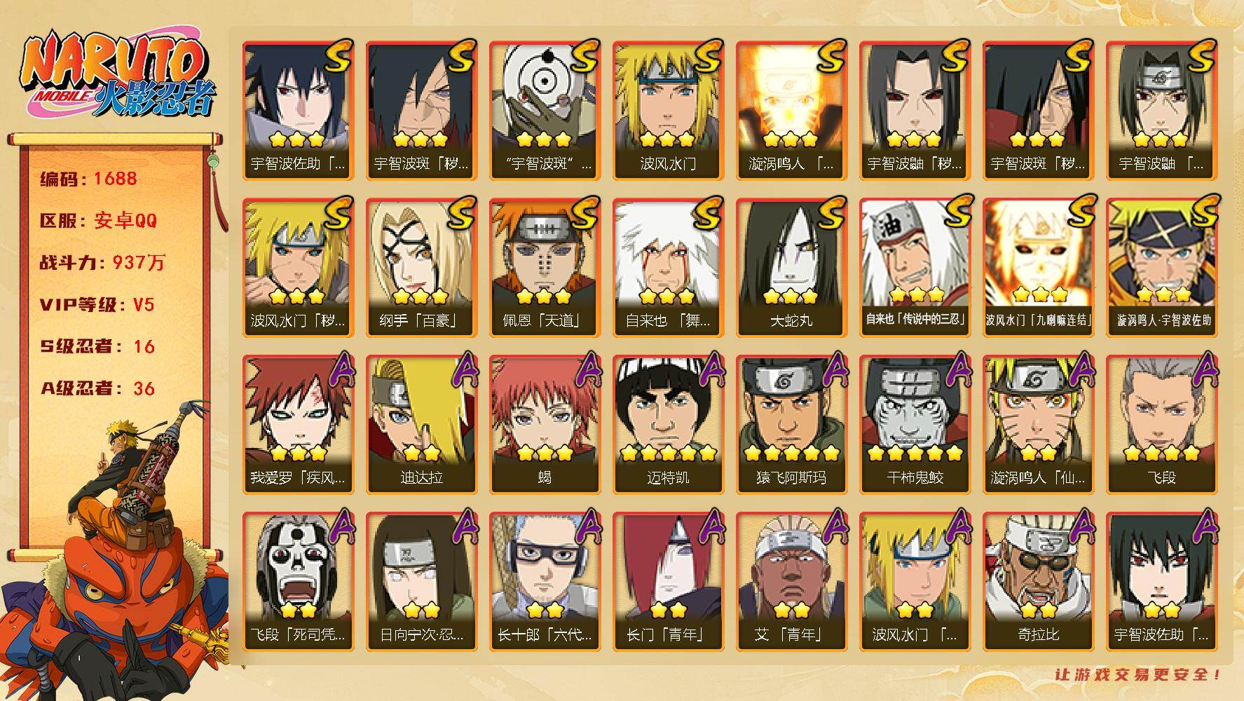 IOS/12S忍/25A忍/战力638W/V8/区服679【S忍者】艾「忍界大战」,宇智波斑「秽土转生·解」,宇智波佐助「永恒万花筒」,漩涡鸣人「九喇嘛连结」,自来也「舞之豪杰」,旗木卡卡西「须佐能乎」,自来也「传说中的三忍」,漩涡鸣人「暴怒·第六尾」,波风水门「秽土转生」,宇智波鼬「须佐能乎」,佩恩「天道」,波风水门, 【A忍者】长十郎「六代目水影」,日向