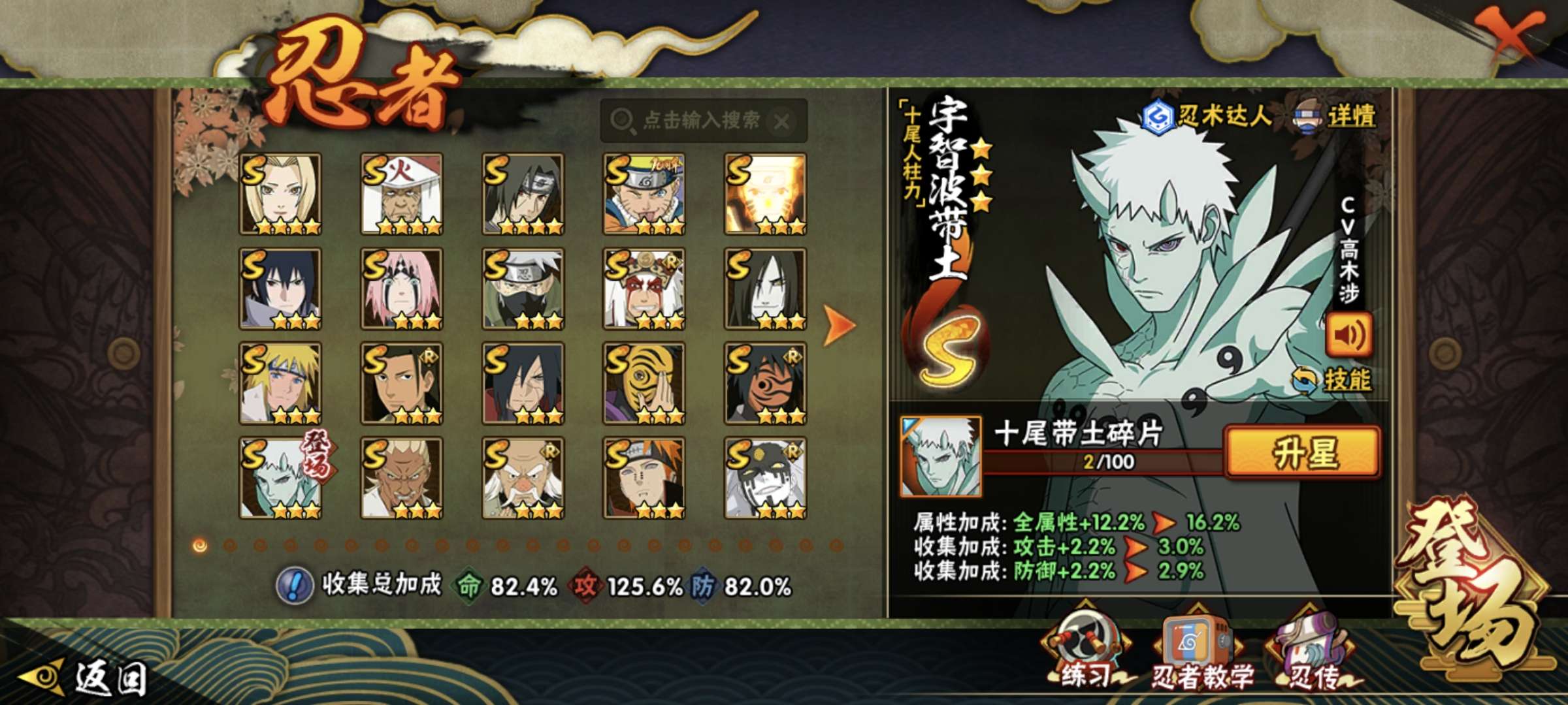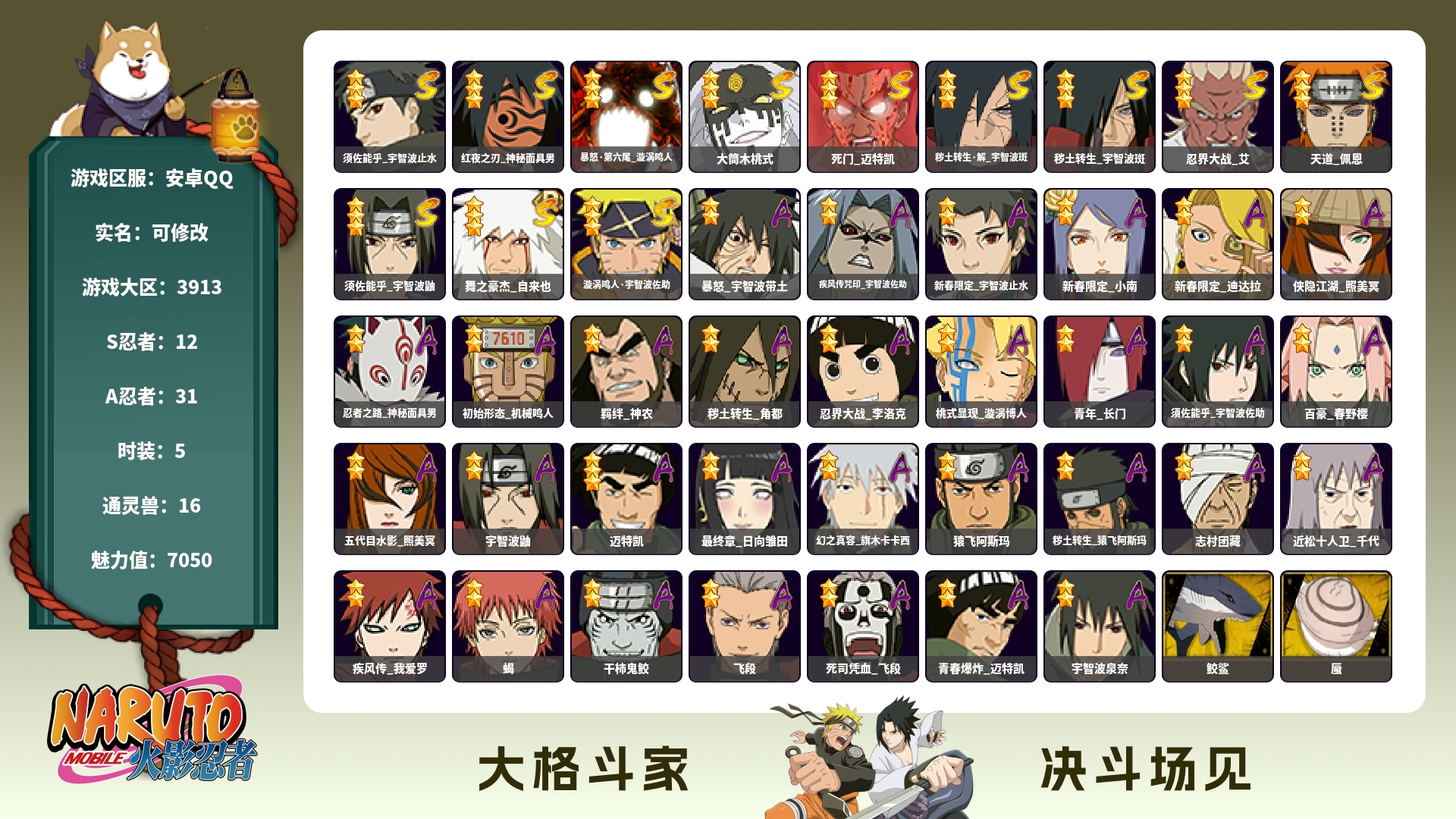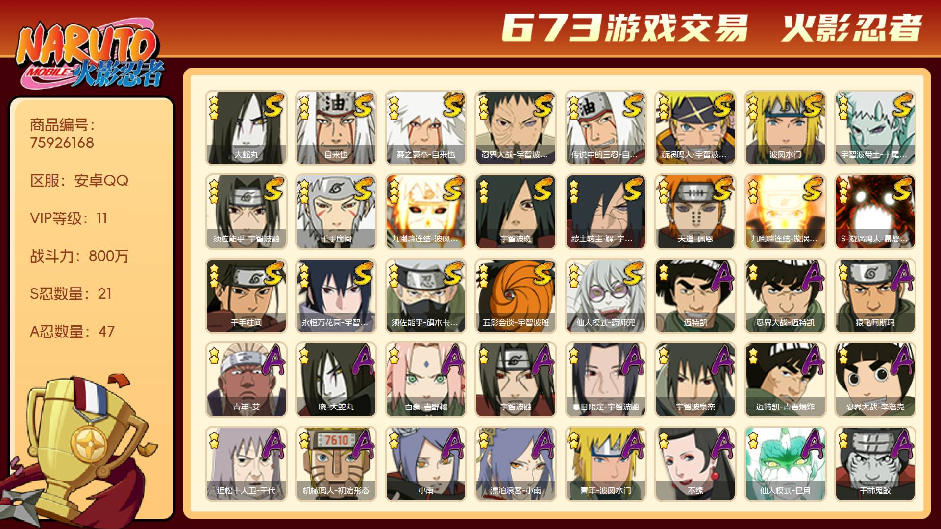 角色等级146 金币500 战斗力800万 S忍21 A忍47 11 段位上忍