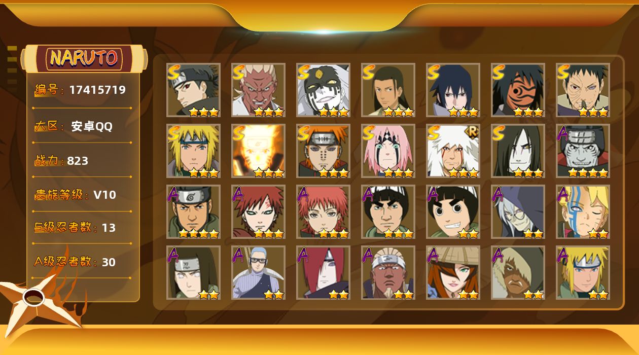 角色等级148 金币500 战斗力11100000 S忍25 A忍49 10 段位上忍