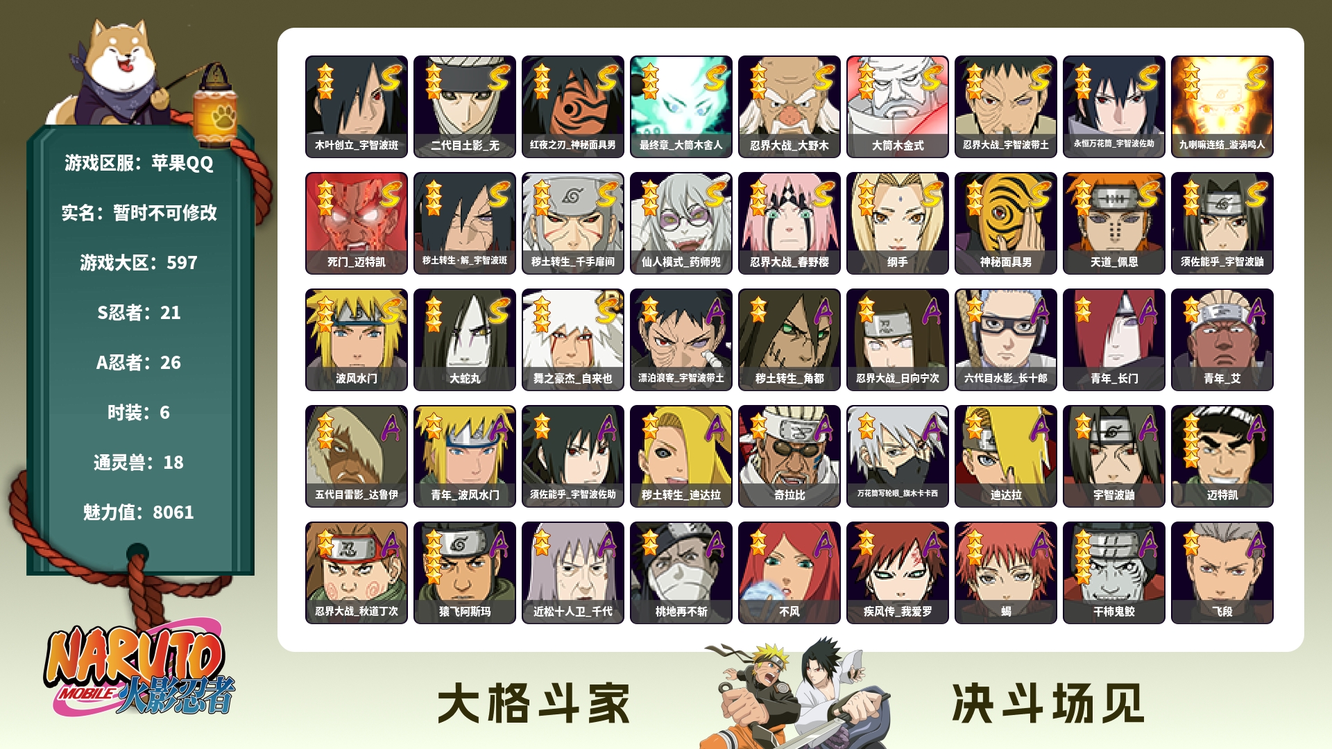 A忍数量:19 S忍数量:8 VIP等级:8 战斗力:4425059 砂之守鹤