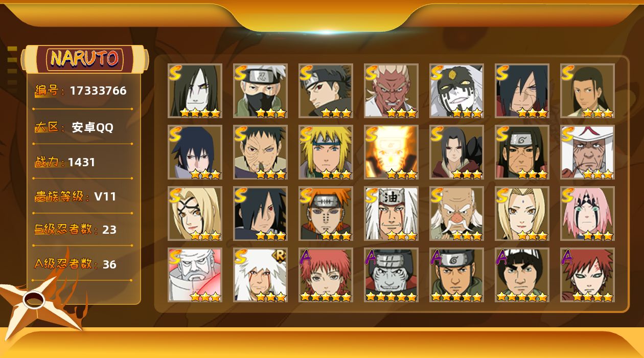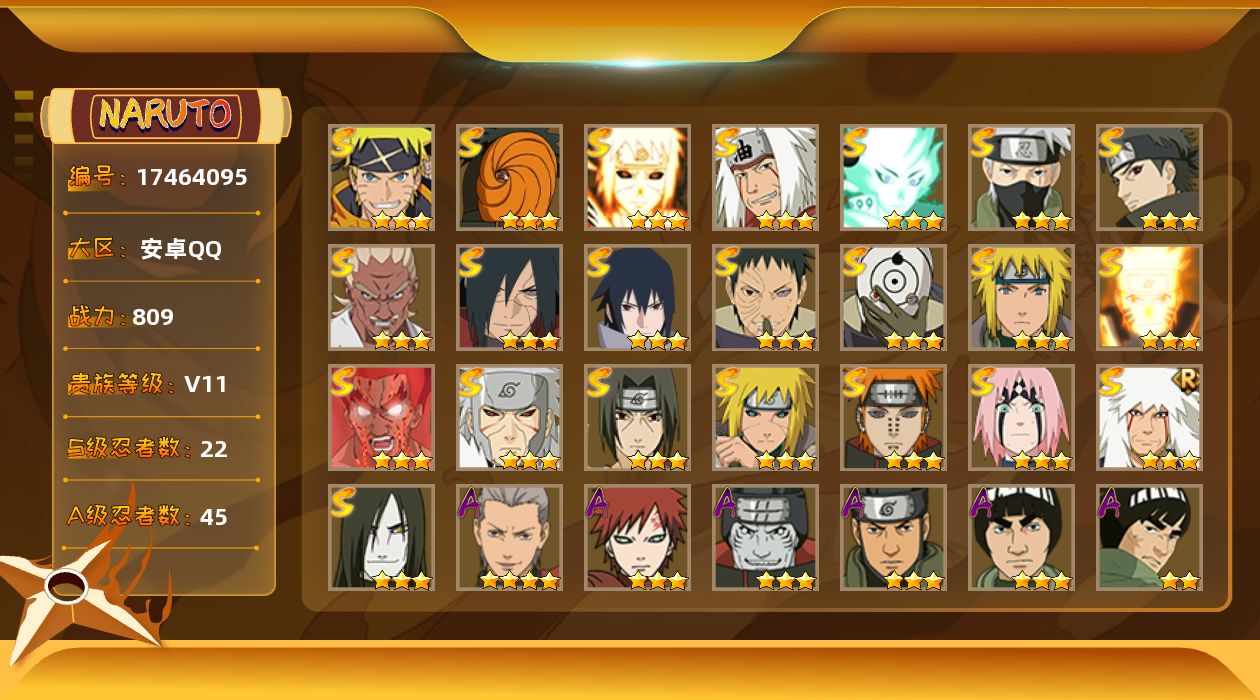 VIP9,851W战力,S忍25个,A忍46个,金银角98片,带土59片,创立