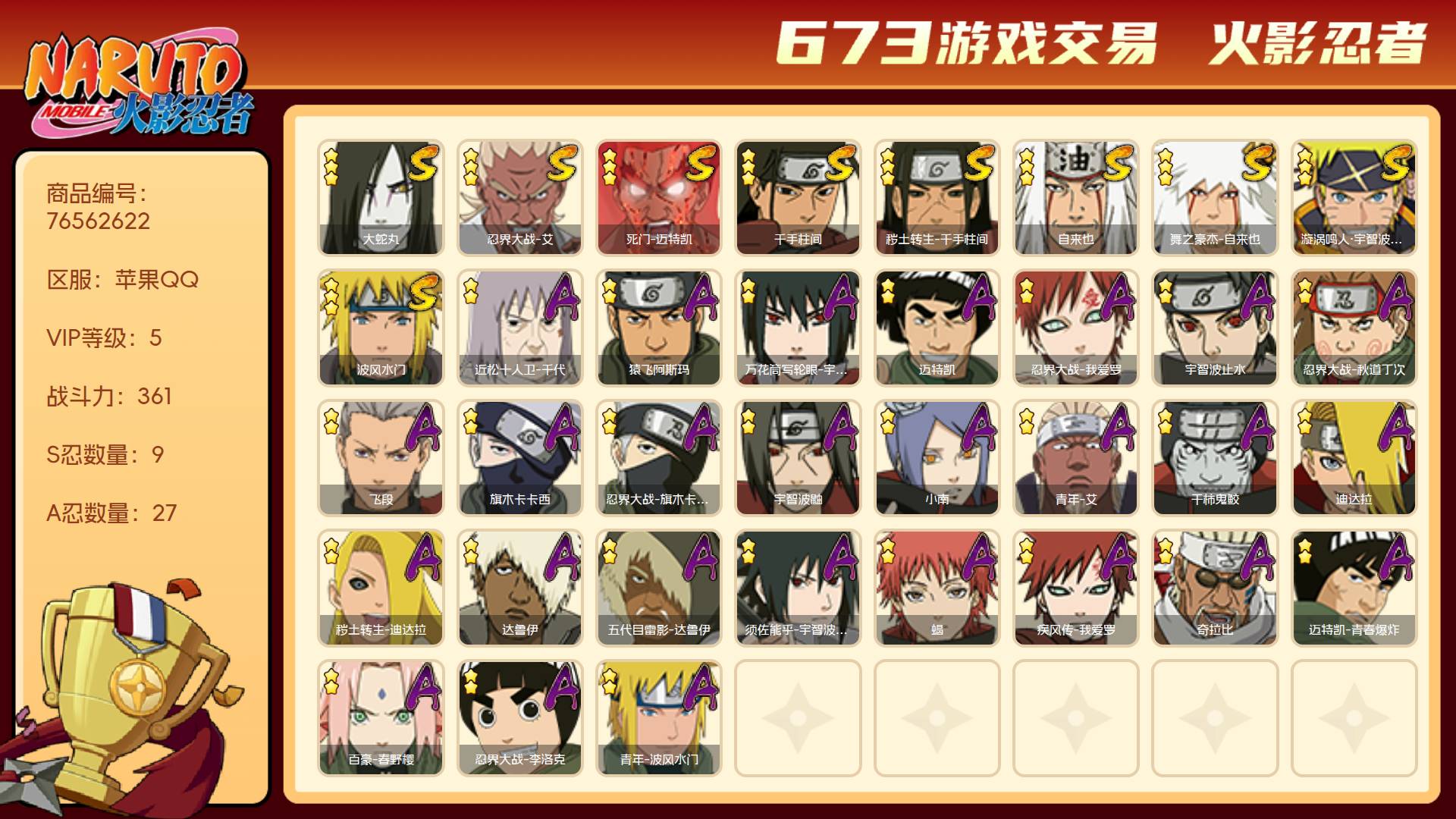 火影忍者手游账号出售,可刀