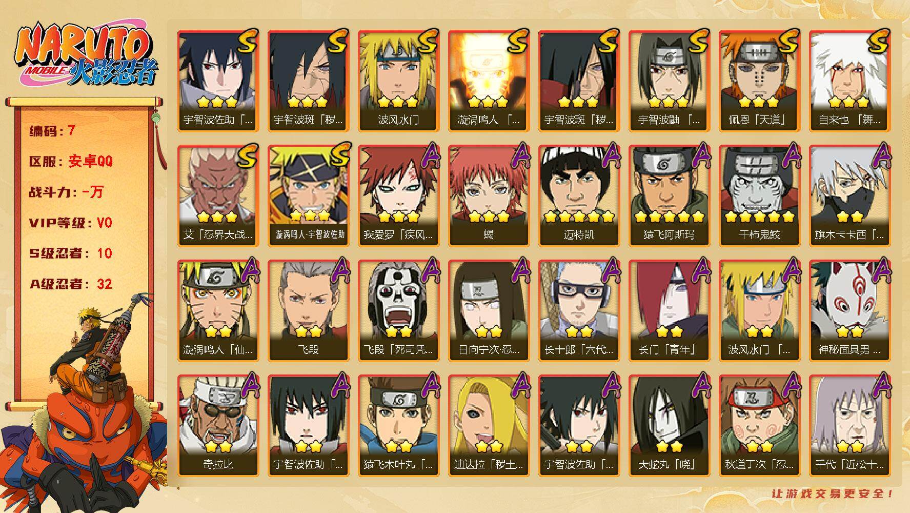 VIP等级V0/S忍数量10/A忍数量32/秽土转生-宇智波斑/忍界大战-日向