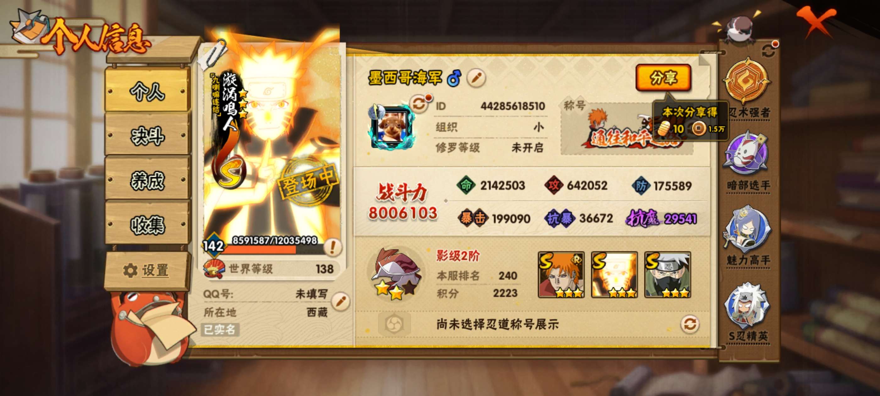 【安卓】仓鼠金币708号,141157金币,43张高招卷,1990限时点券,火影忍者手游QQ区,蜀面