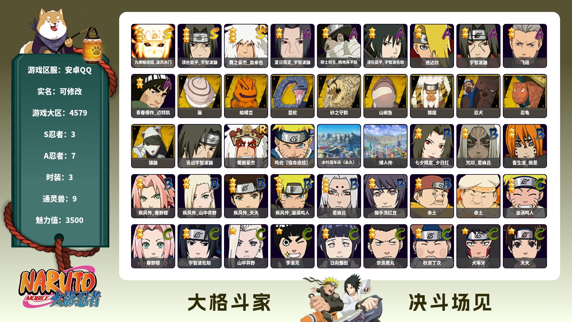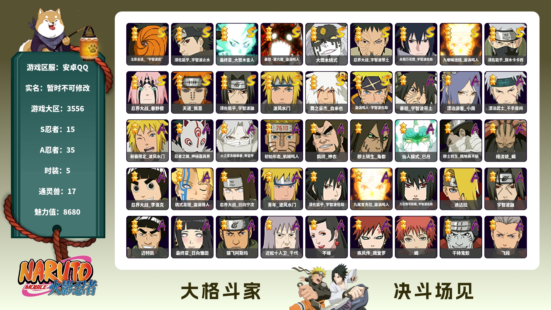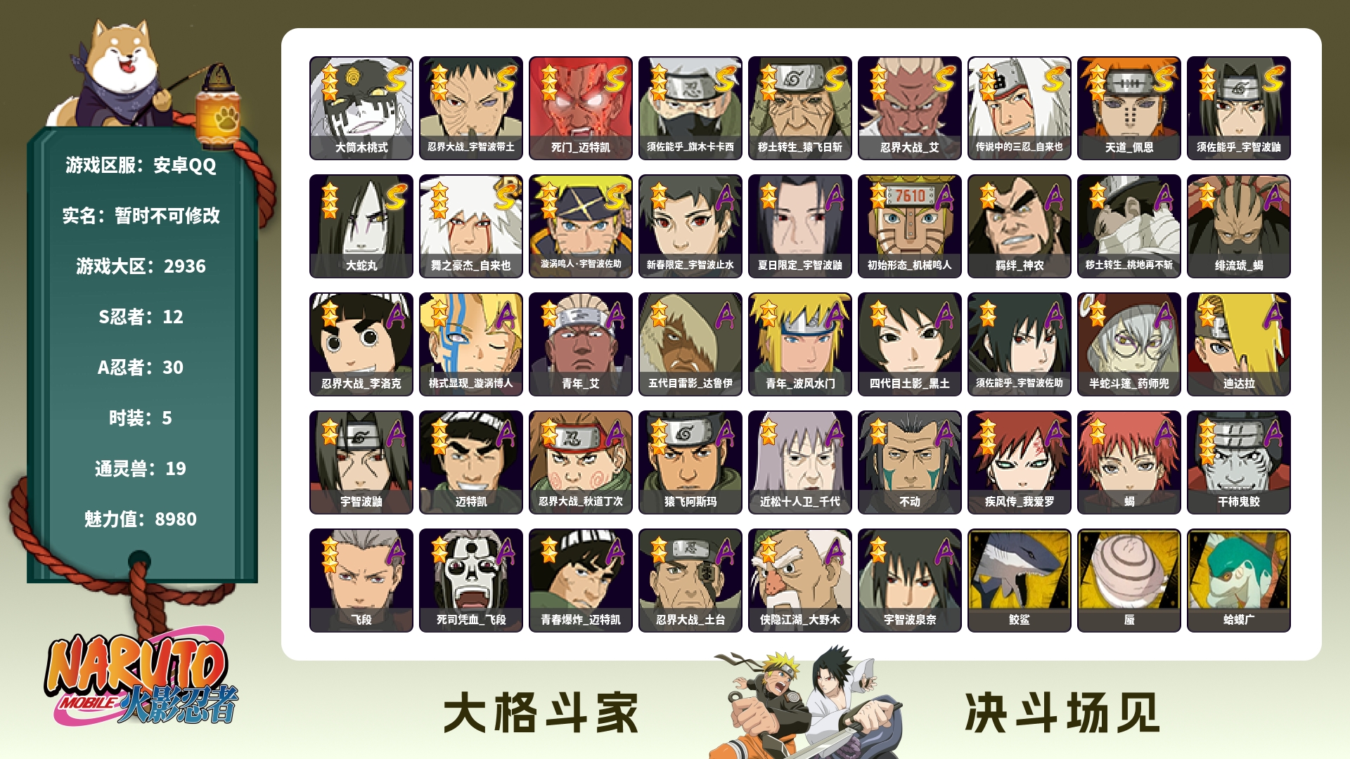 角色等级138 金币800 战斗力3939148 S忍10 A忍26 7 段位中忍