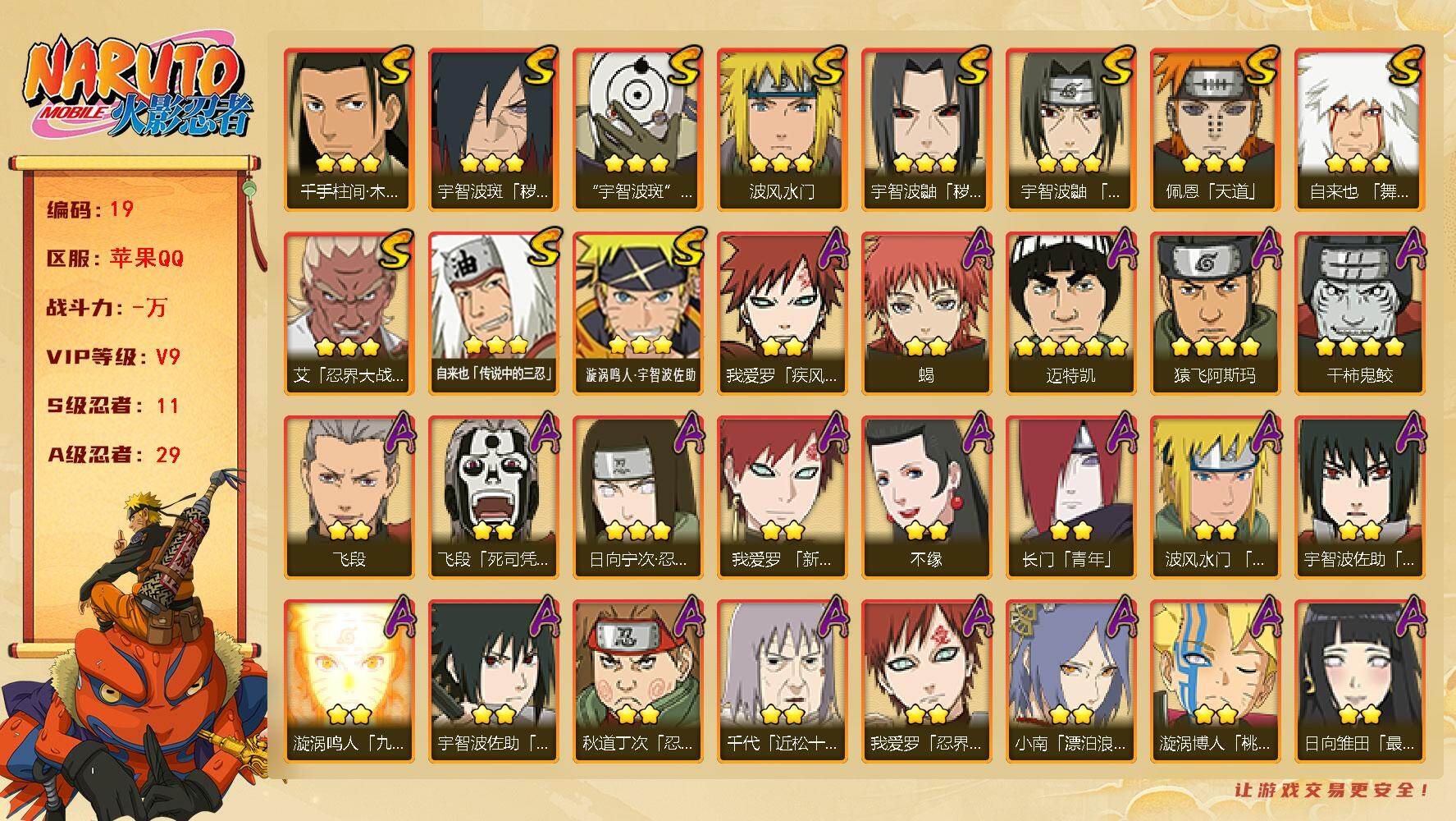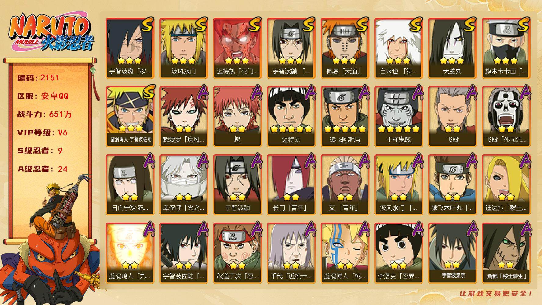 (可免费转苹果)v6,651w战力,9S级忍者数-24A级忍者数,1.3w金币