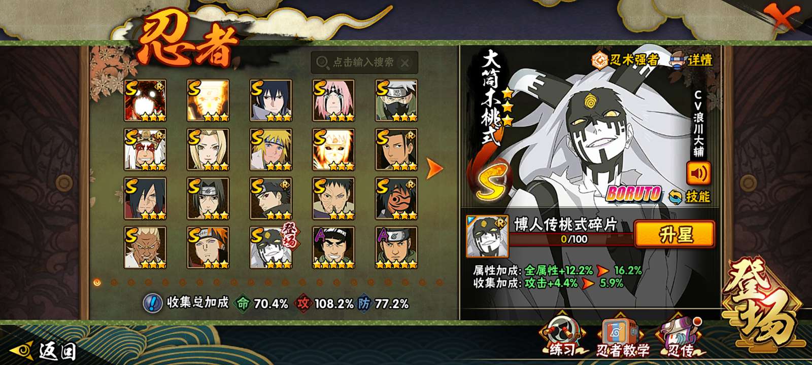 买了你就是超影,17s稳22s。死水98片,传说自来也97。小胡子93。大蛇丸65,纲手59。时空间