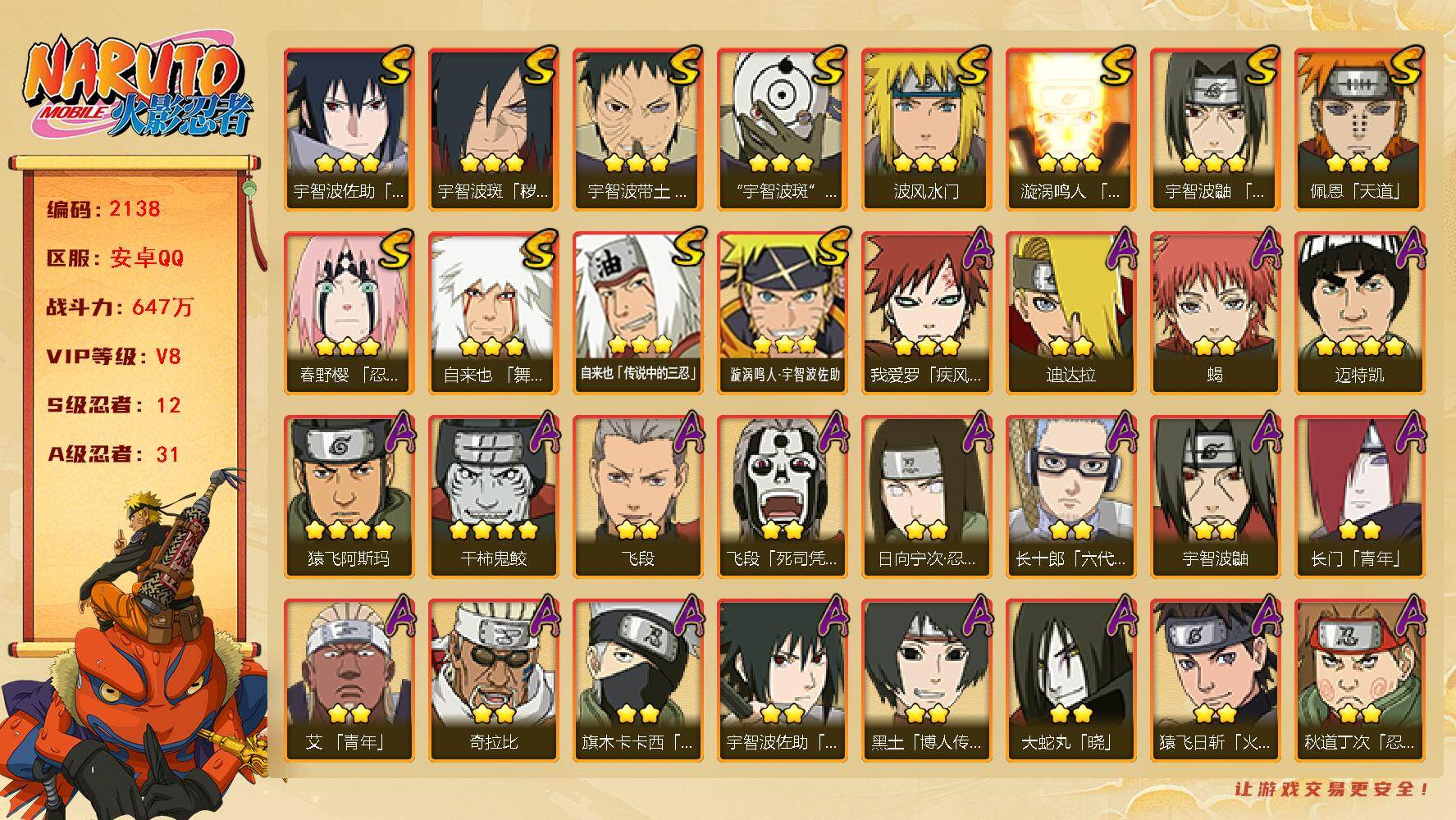 v8 647万战力 12S 31A 38高招券 240点券 红面具80片 忍战