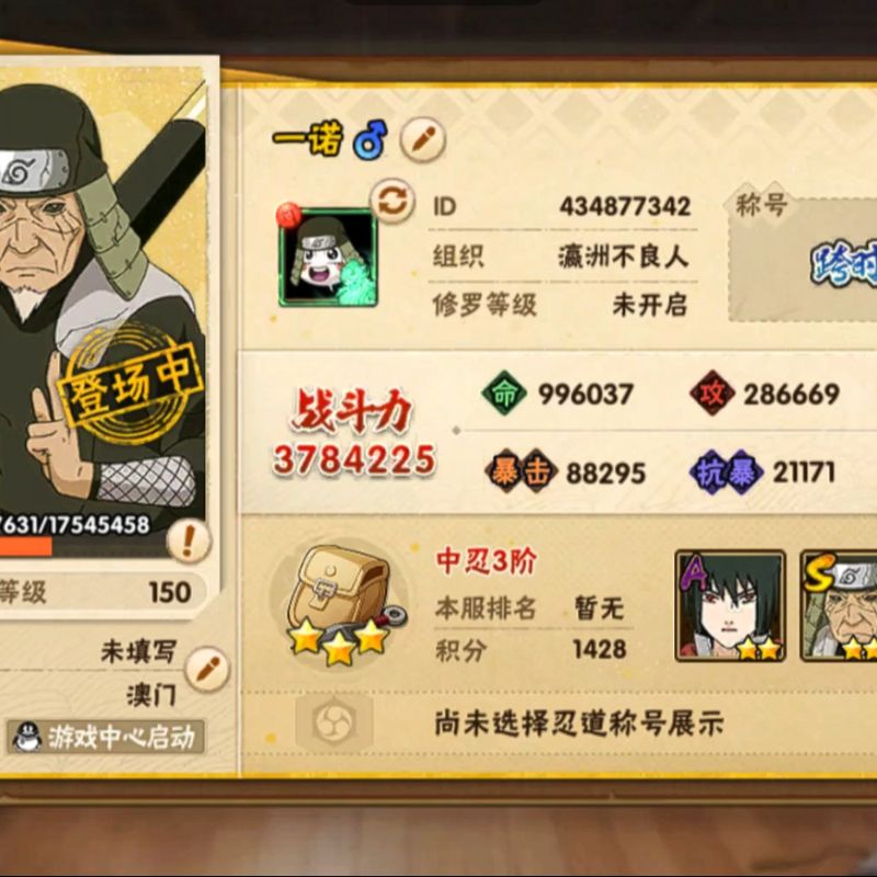 角色等级151 金币1 战斗力10000000 S忍24 A忍41 1 段位新生