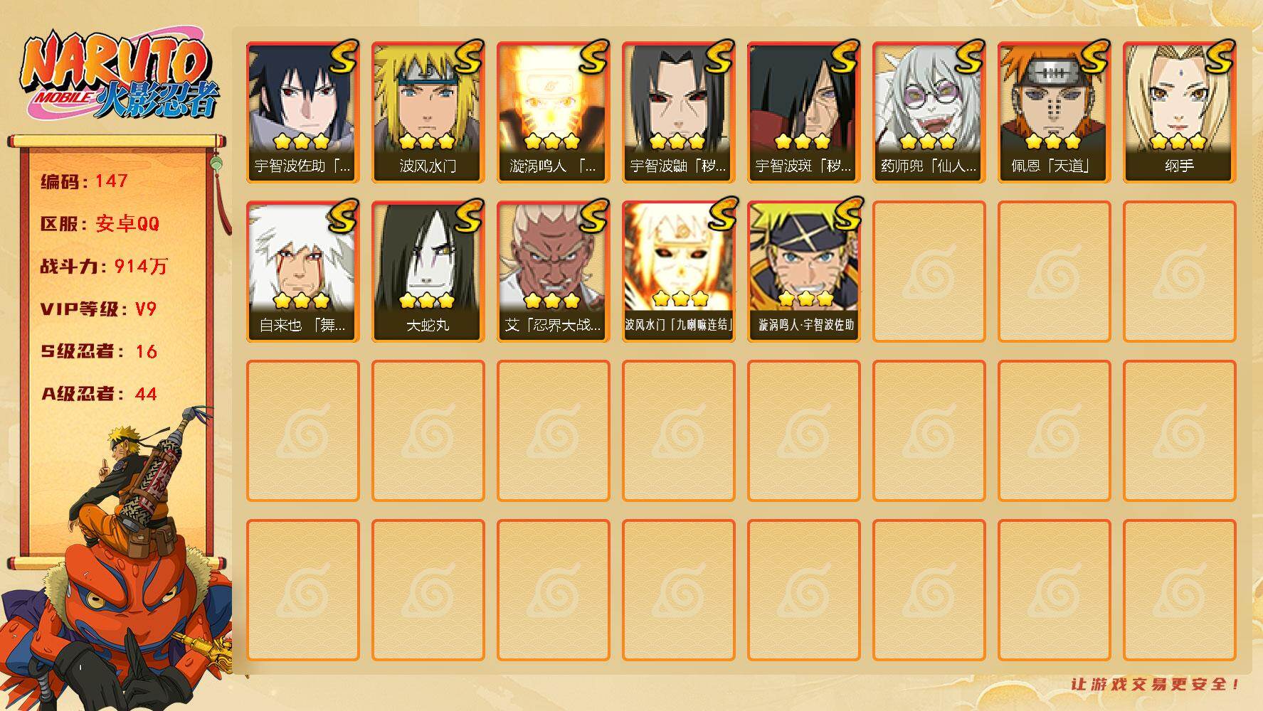 21s,70A,高战,已开启198档忍法帖,十尾带土70片,该区战力第二,询问号内详情请私,放心交易