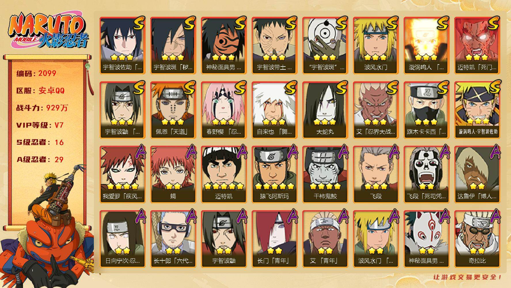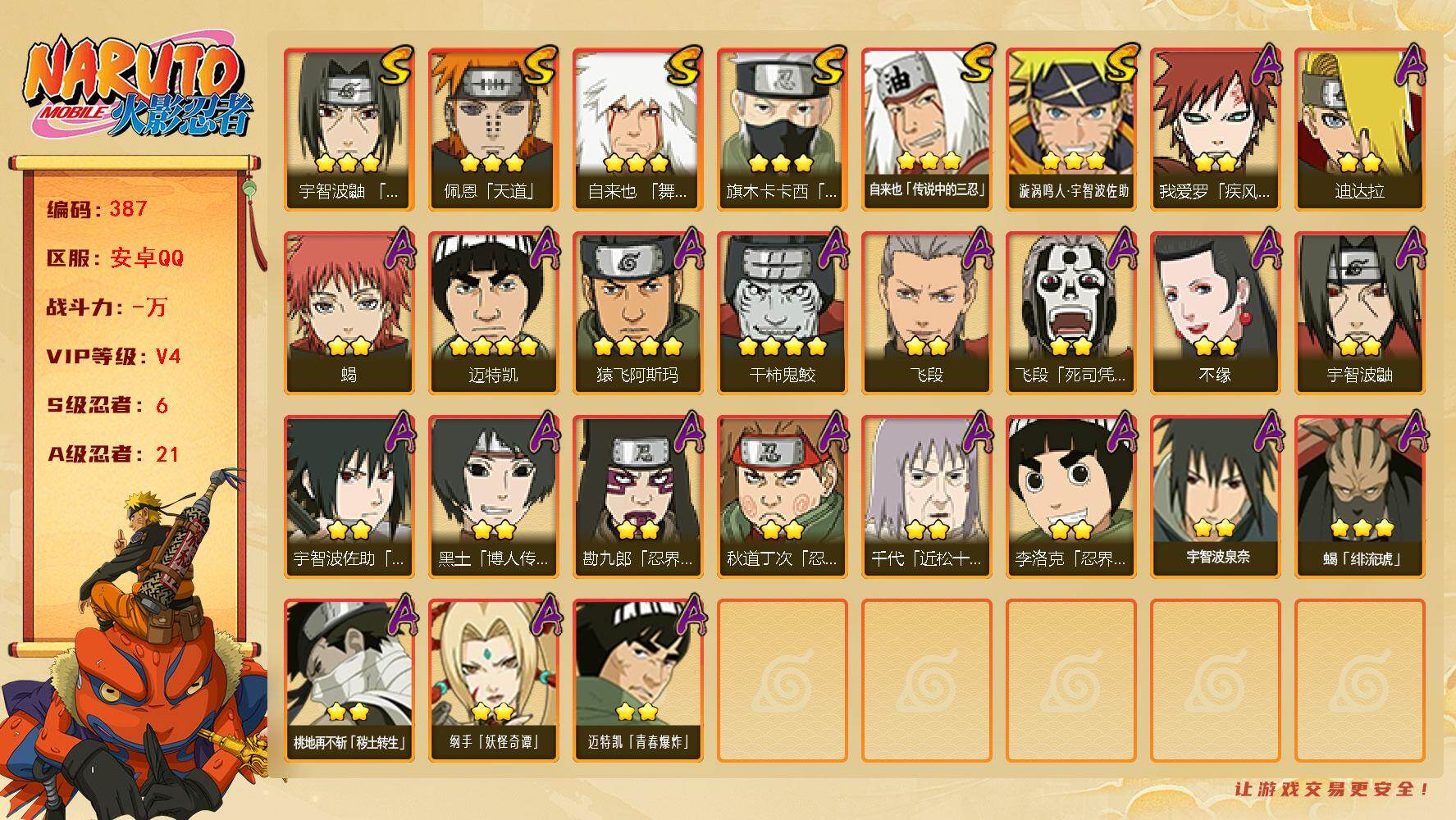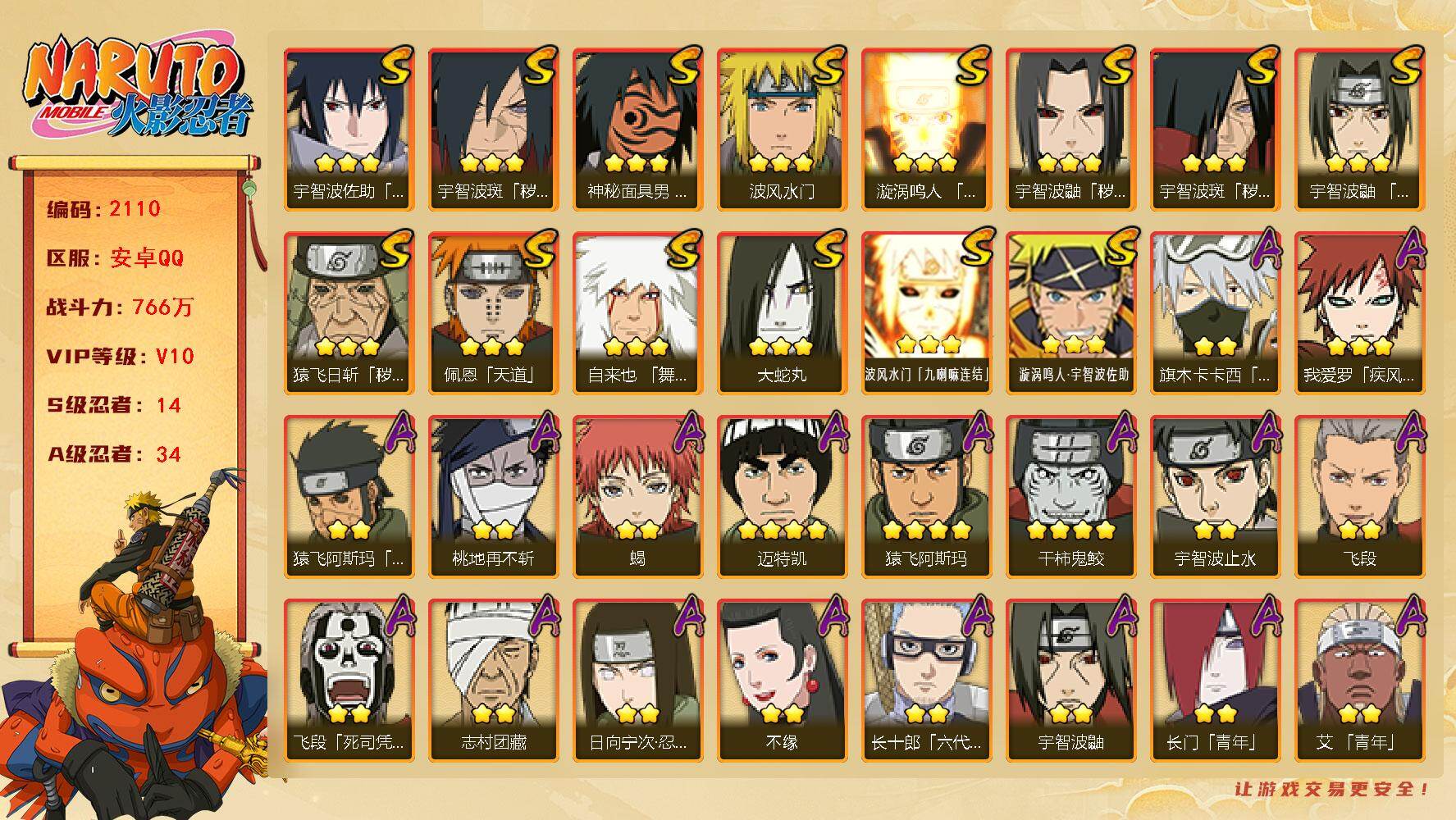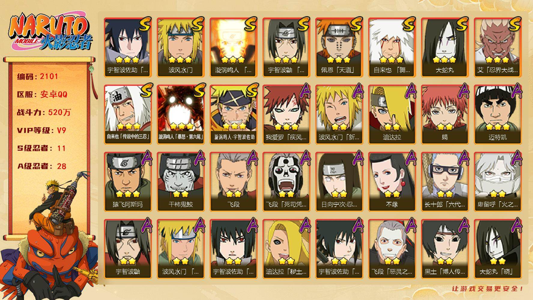 安卓qq/v11/成品小极品账号/1千4百万战力S忍者数: