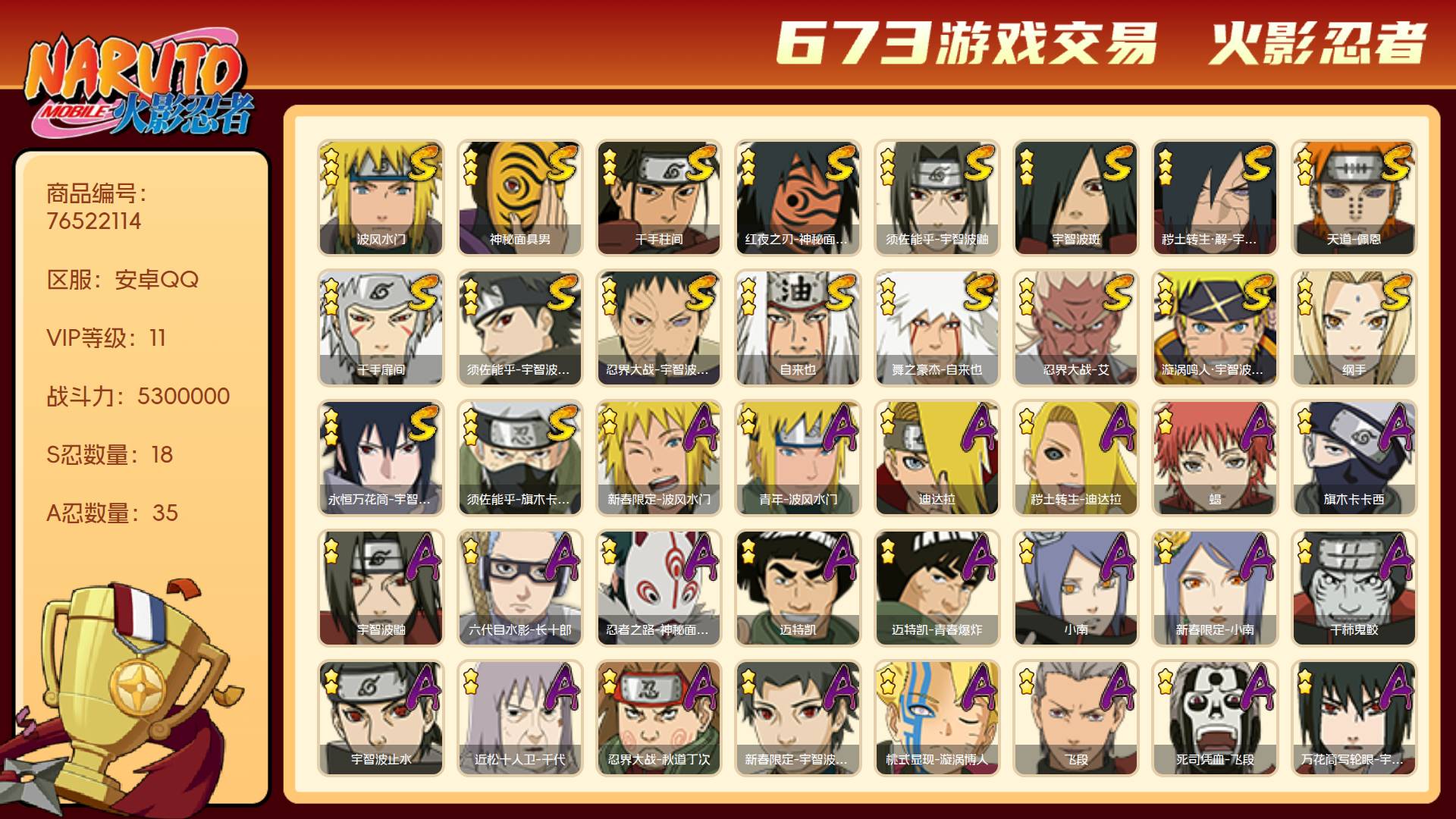 安卓QQ-可以二次!-v9-中忍-1034w战力成品号-到手即可畅玩-宇智波带土