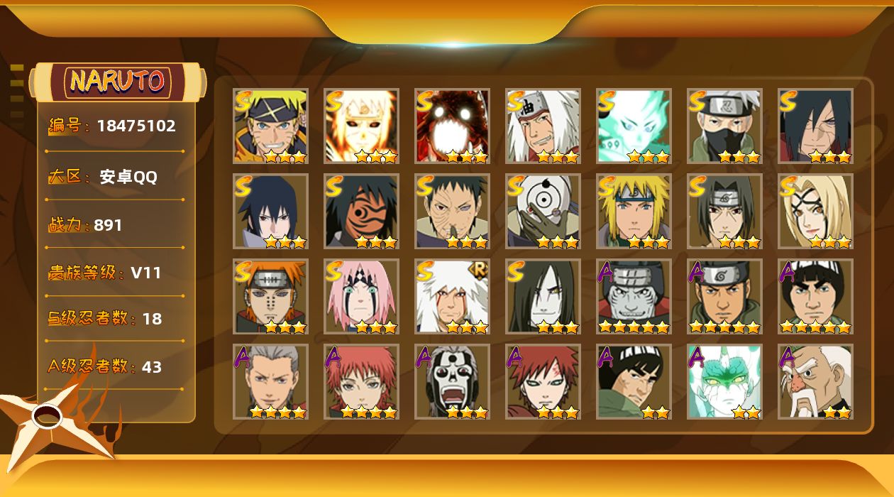 角色等级137 金币2900 战斗力5300000 S忍18 A忍35 5星S忍者06 11 段位暗部