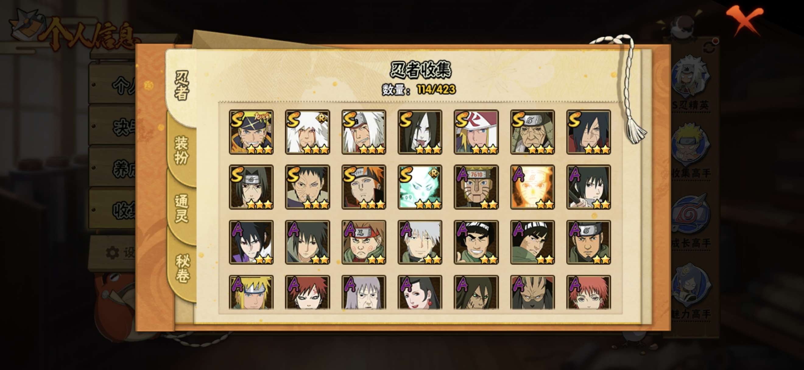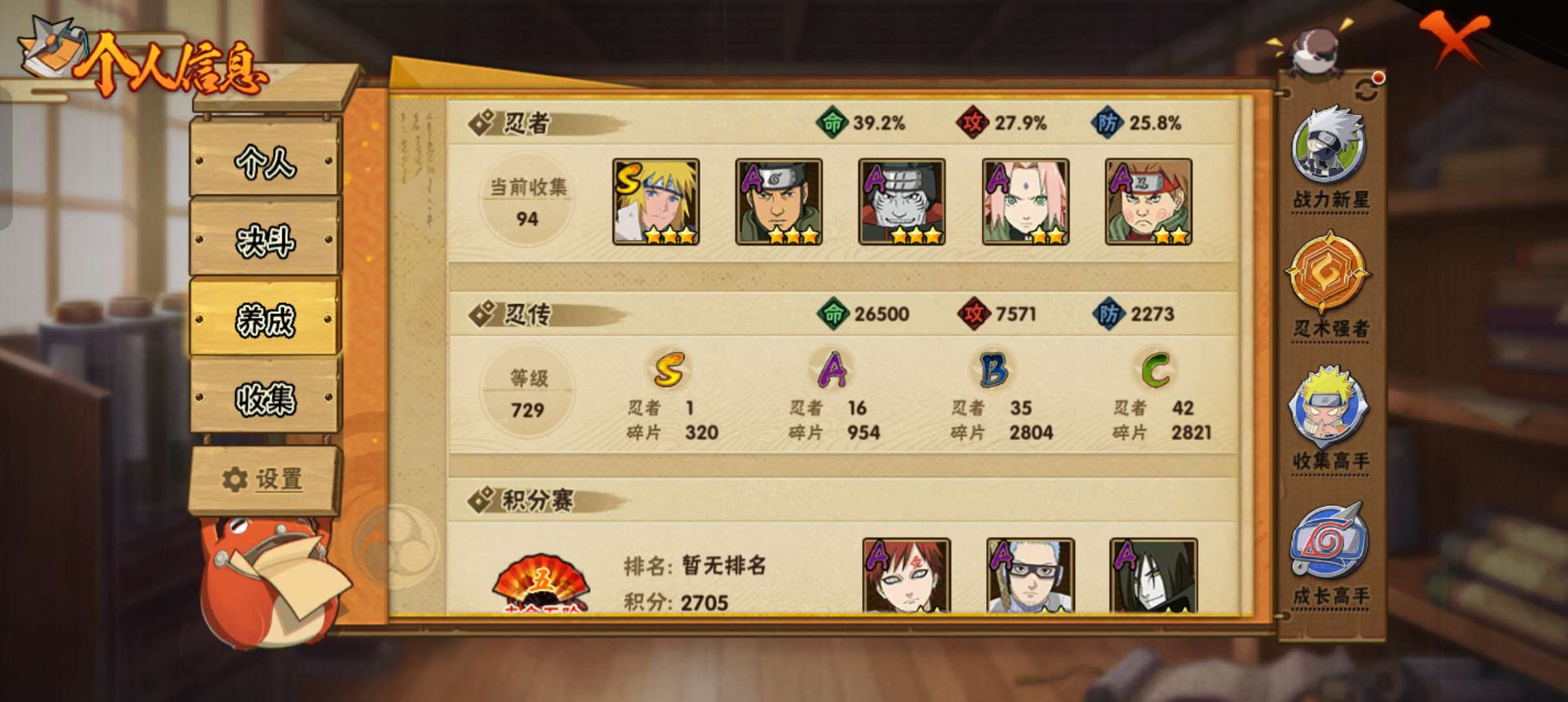 角色等级93 金币18000 战斗力2120000 S忍4 A忍9 5 段位上忍
