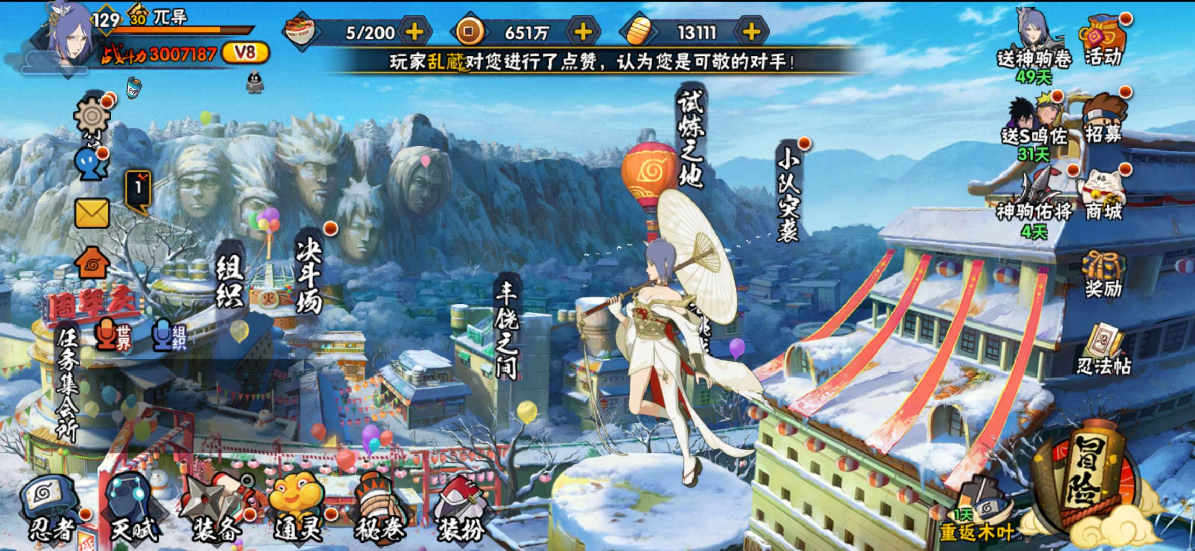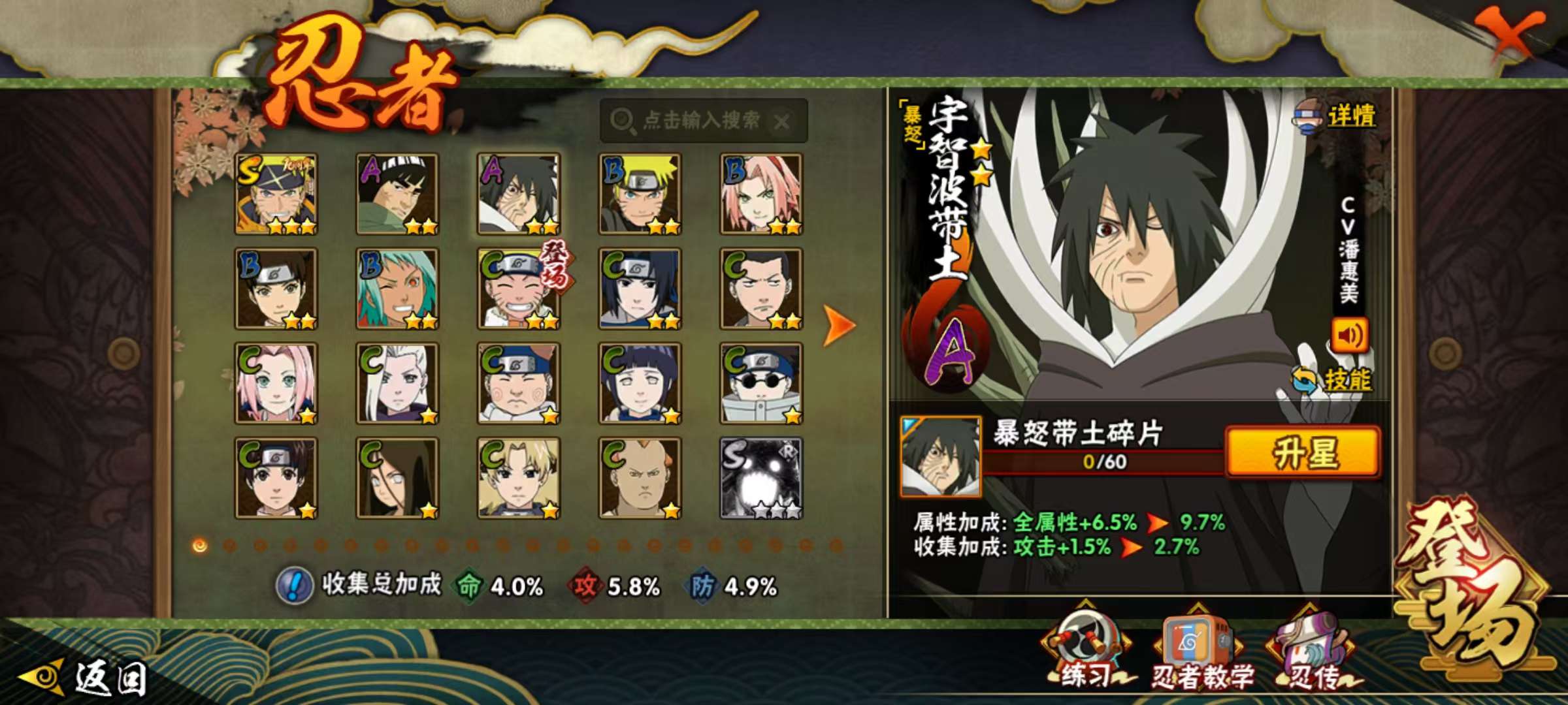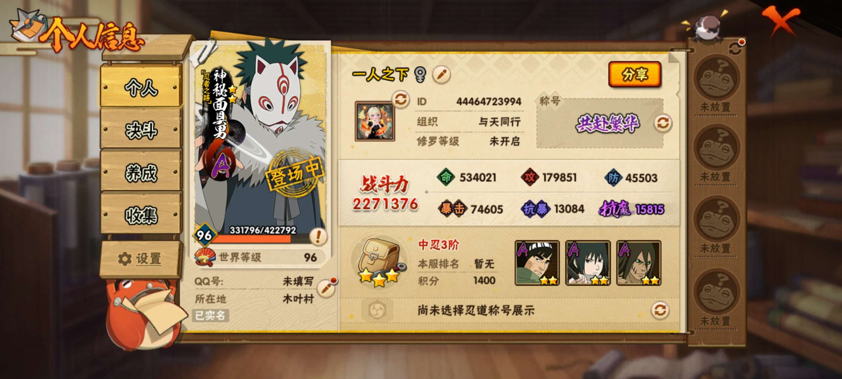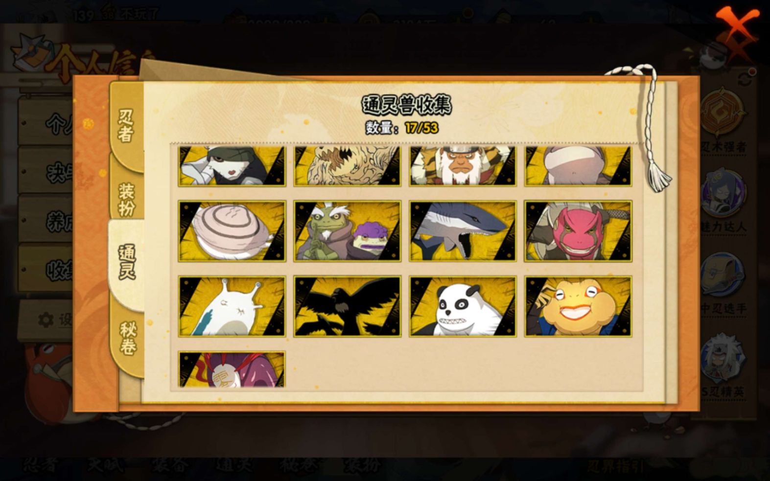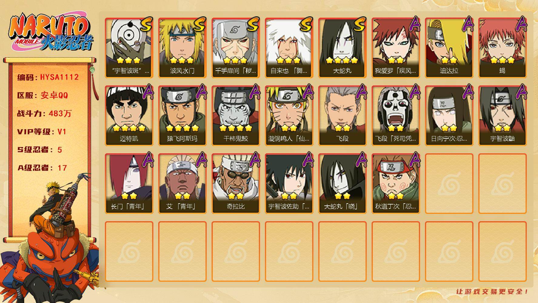V1/战力483W/S忍5/A忍17/通灵兽13/舞之豪杰-自来也/白面具-宇智波斑