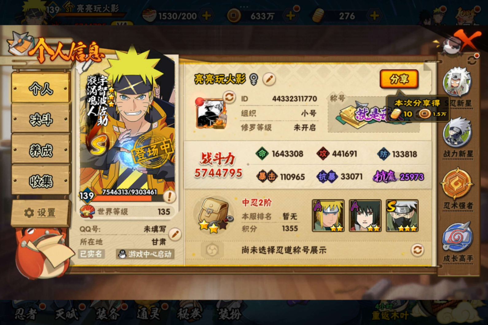 v6,14S,27A,764万战力,十尾72片,zp3452【S级忍者】:千