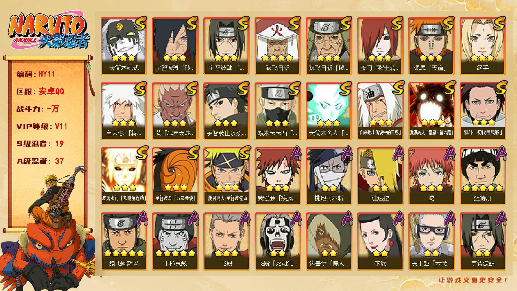 【HYZ3065】V10/战力1700W/S忍37/A忍49/3星宇智波斑「秽