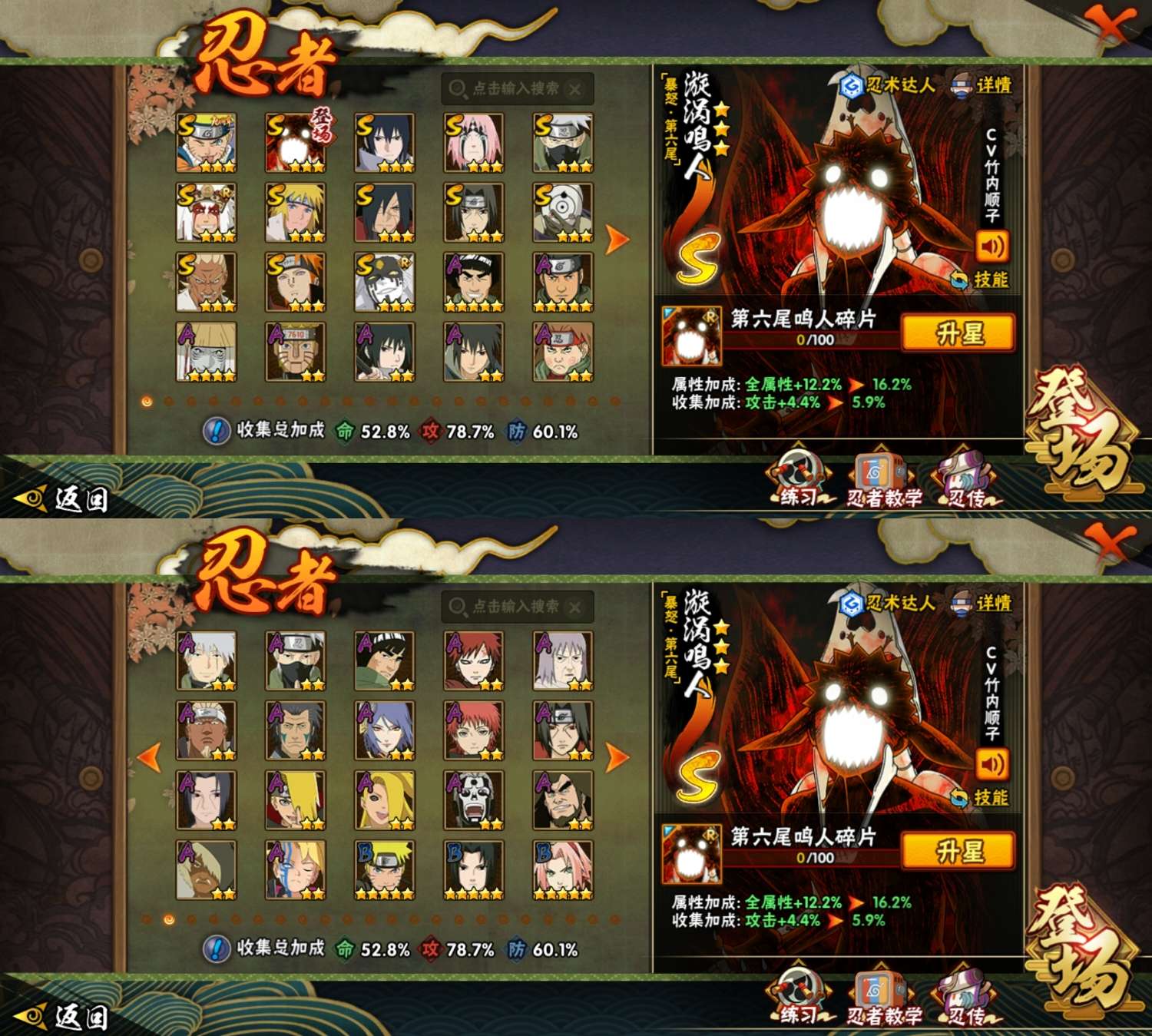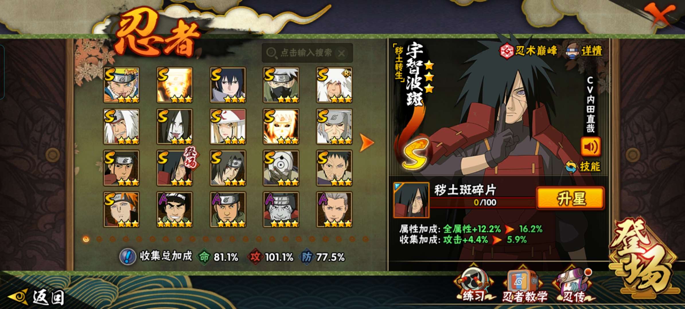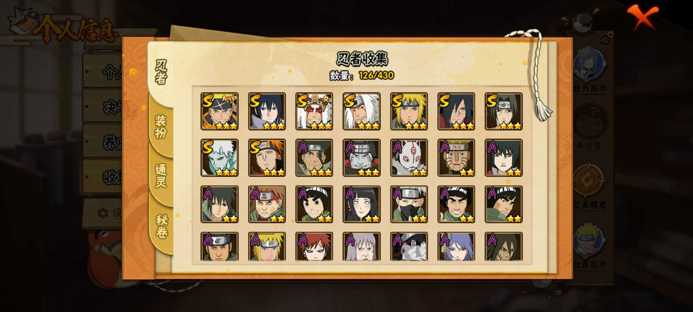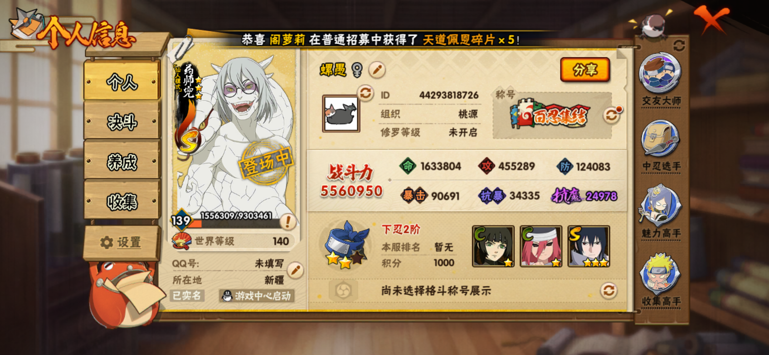 角色等级108 金币51000 战斗力151w S忍3 A忍10 5星S忍者2 1 段位上忍