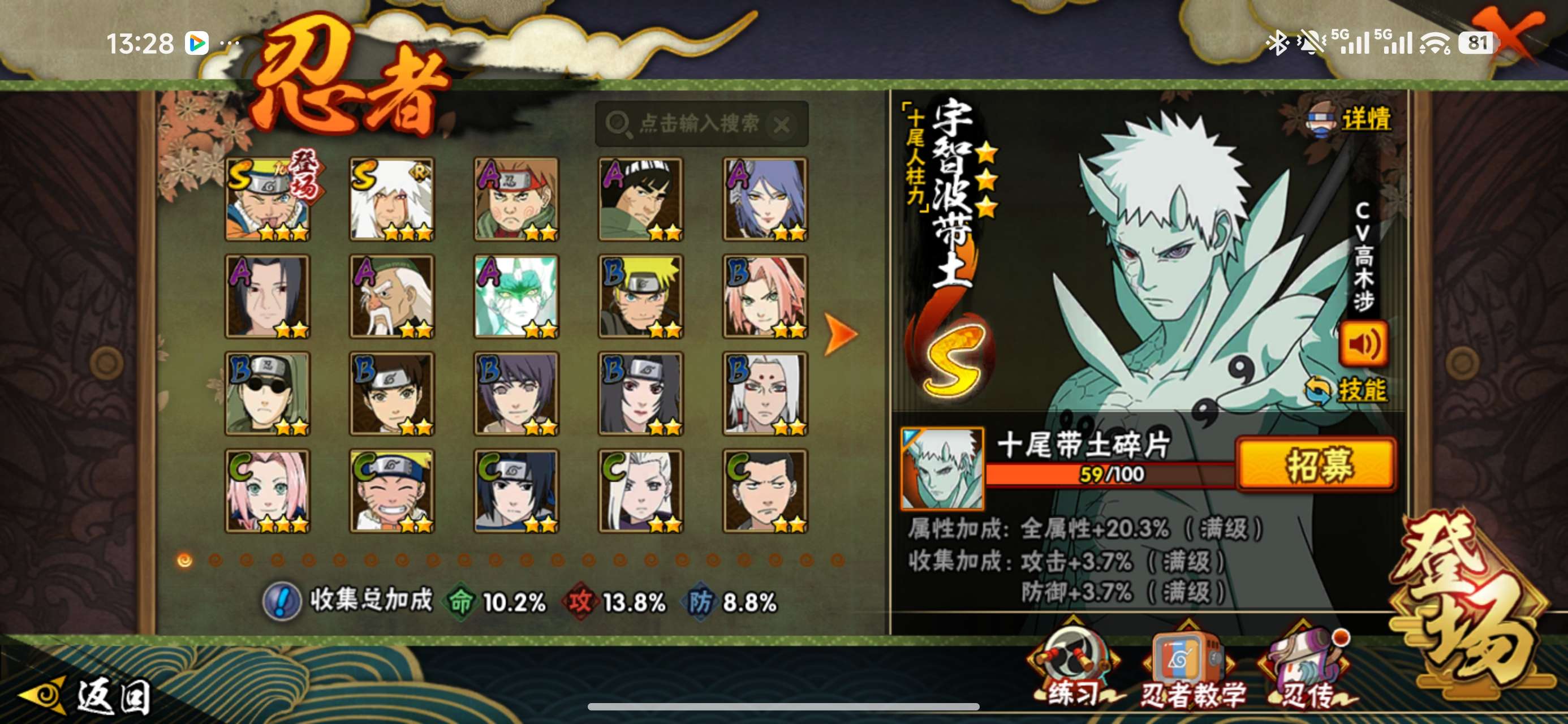 V8/战力819W/S忍13/A忍27/通灵兽18/4星干柿鬼鲛/忍界大战-日向宁次/