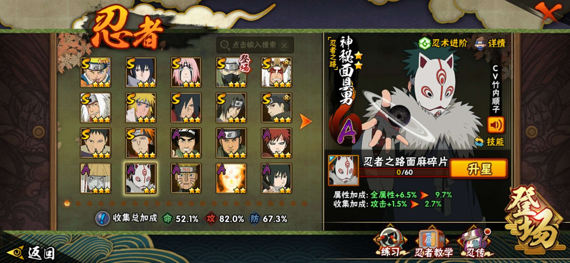 角色等级135 金币600 战斗力5600000 S忍15 A忍25 9 段位中忍
