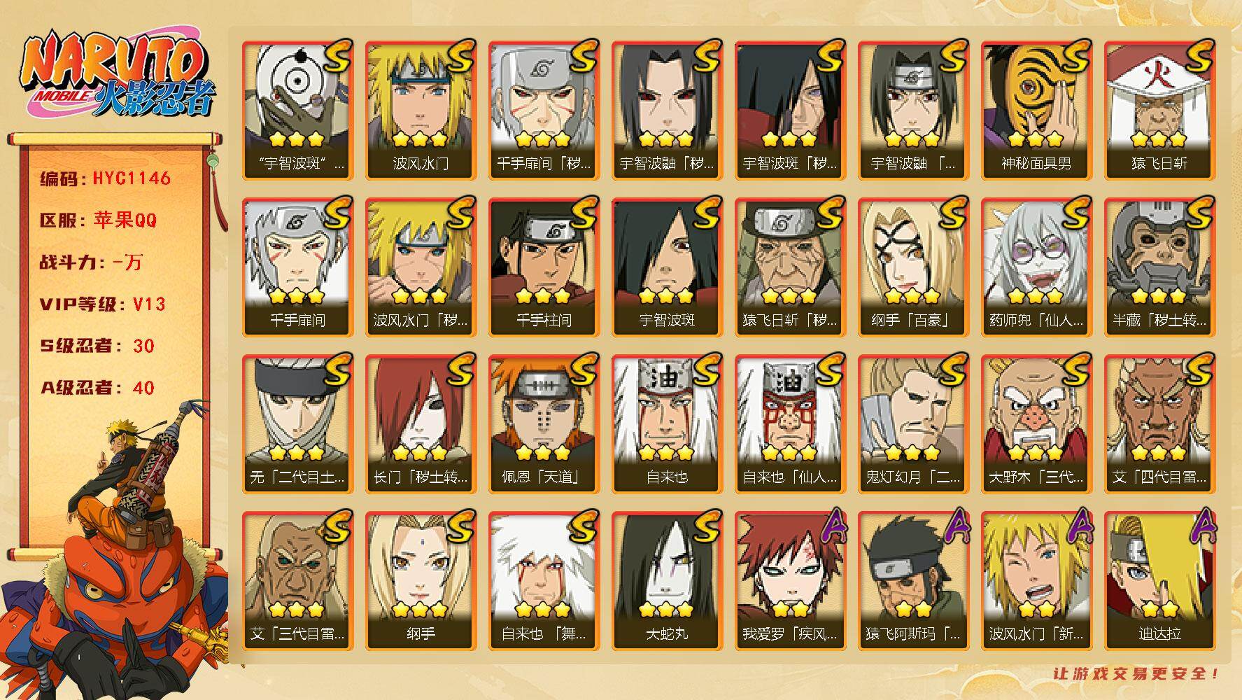 v7,12s准14s,28A,648w战力,金水71片,木叶创立柱间89片,带土,须佐止水,面麻,再