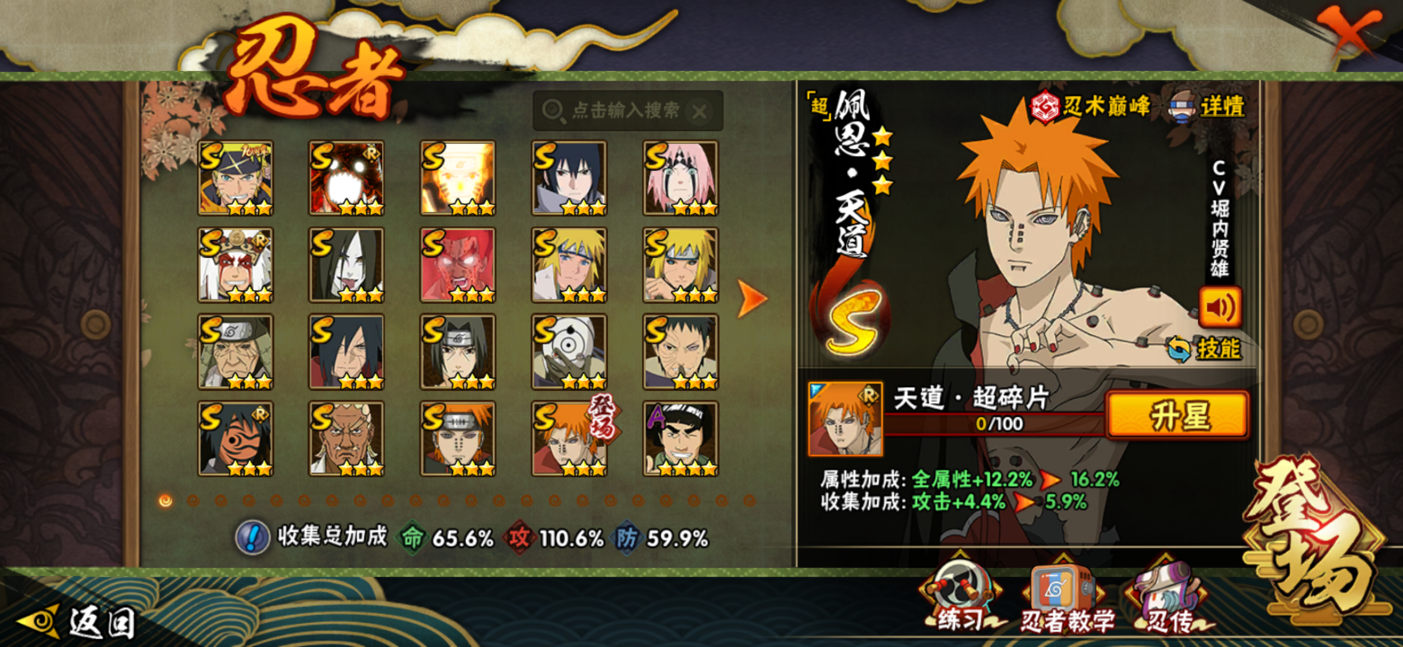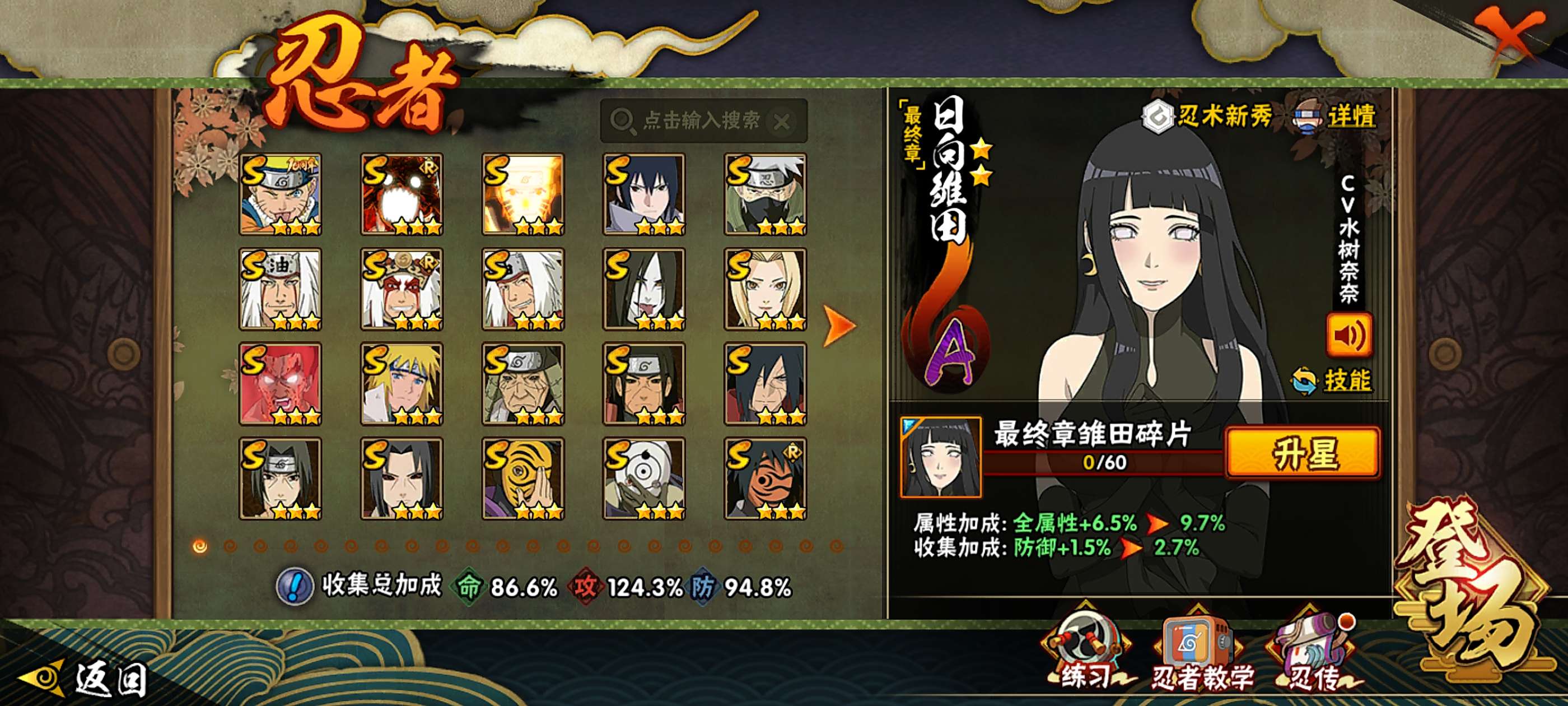 角色等级141 金币12000 战斗力6370000 S忍18 A忍38 5星S忍者14 10 段位中忍