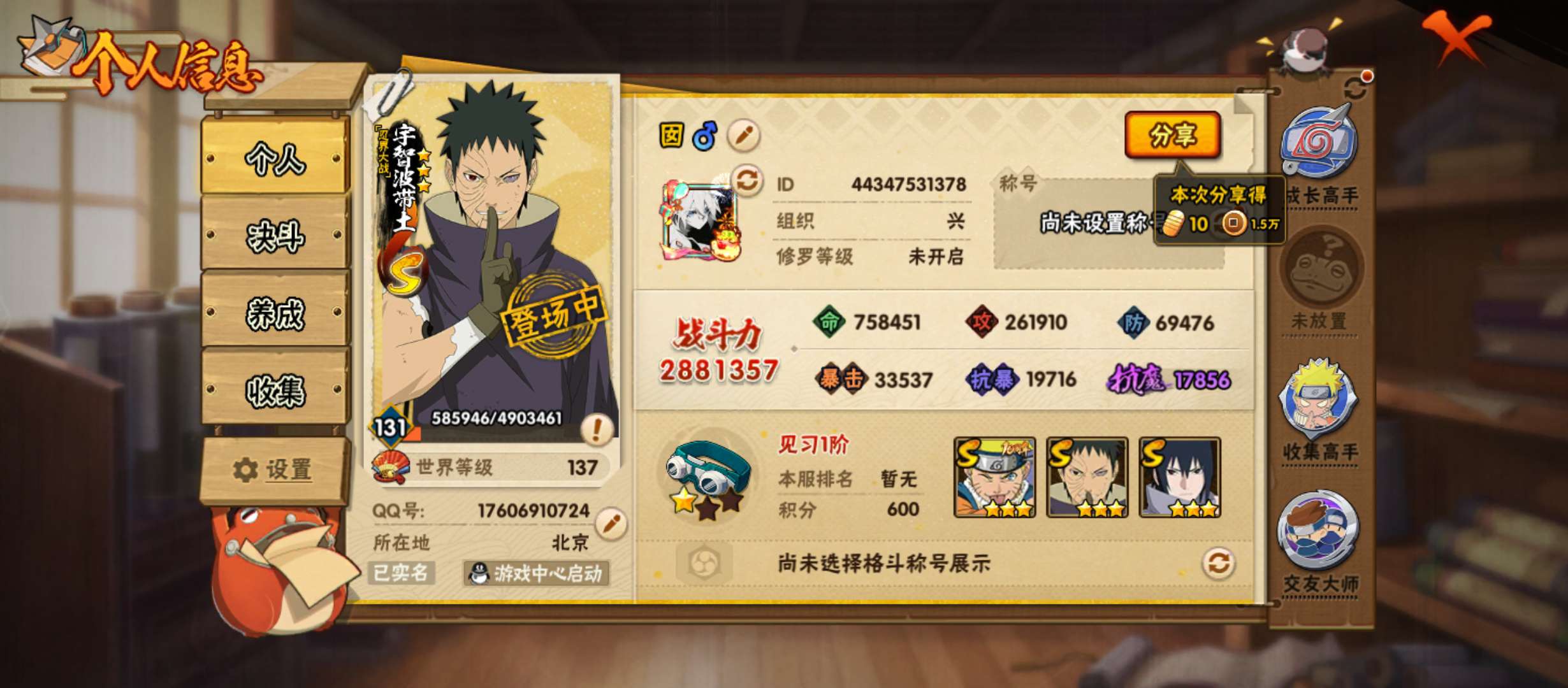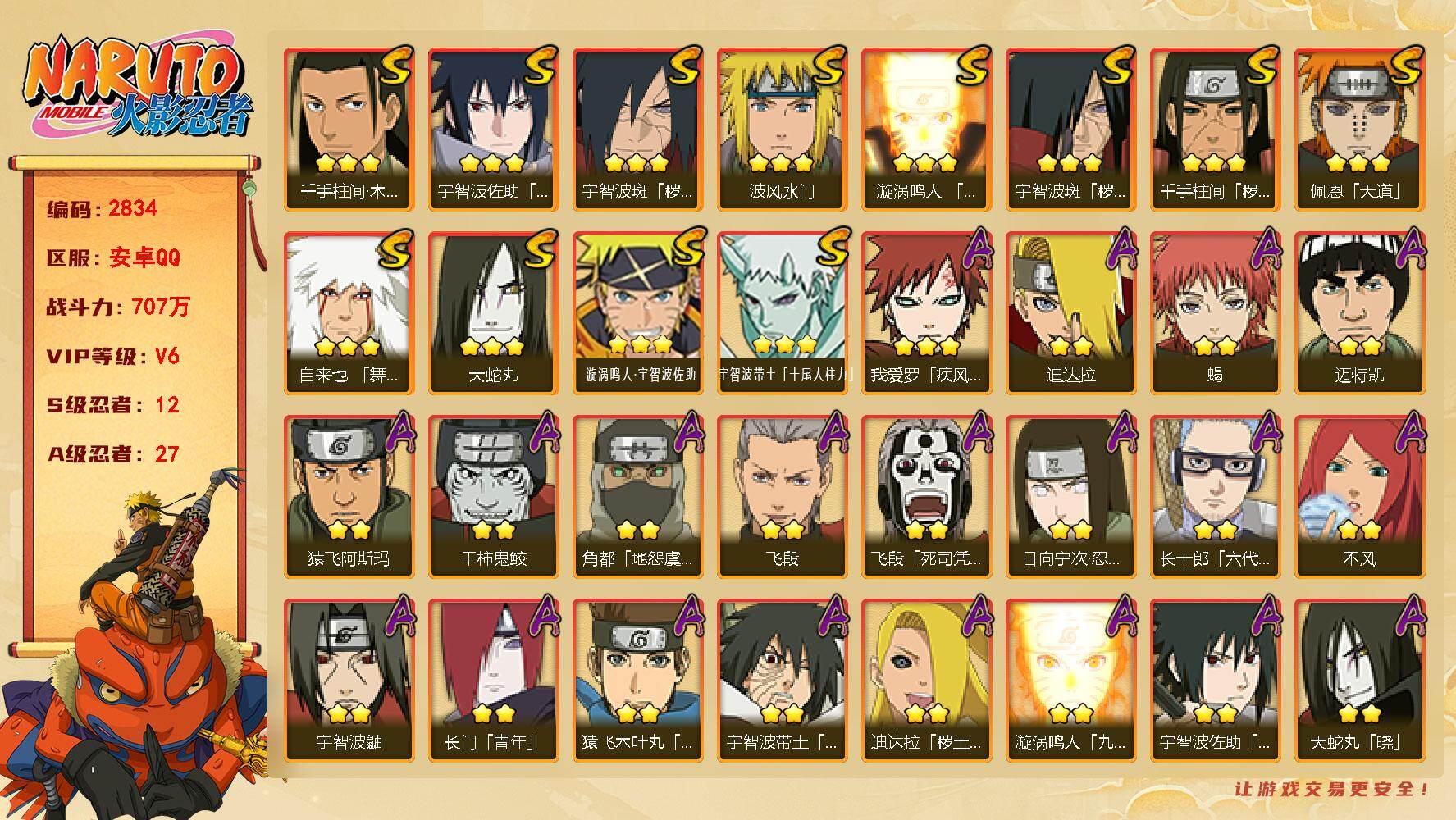 【4S+金币】豪杰自来也s+百战水门s+佩恩s+解班s+忍战宁次A +3W金币
