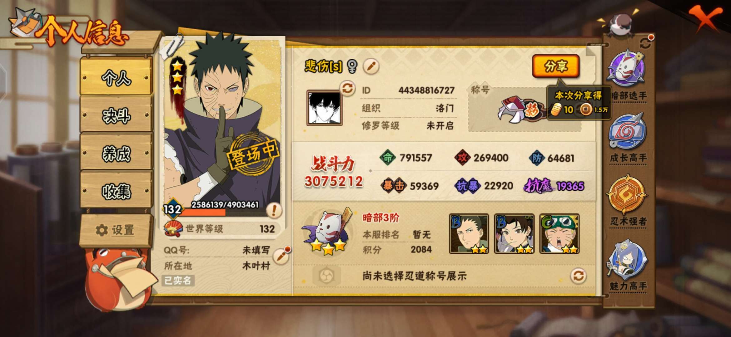 安卓QQ v11 26s 41A 1140万战力 忍战樱78片 自来也98片 传说自来也