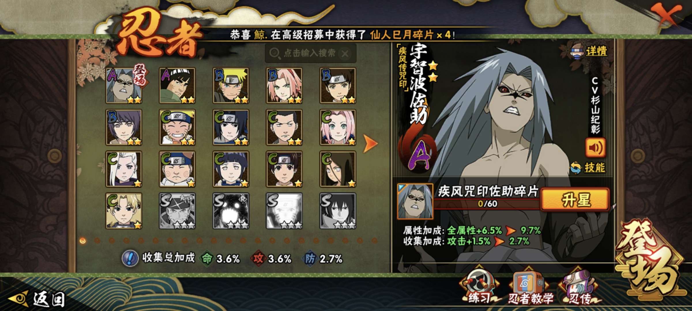 264w战力解斑4S+暴怒带土12A战力264忍者总数61游