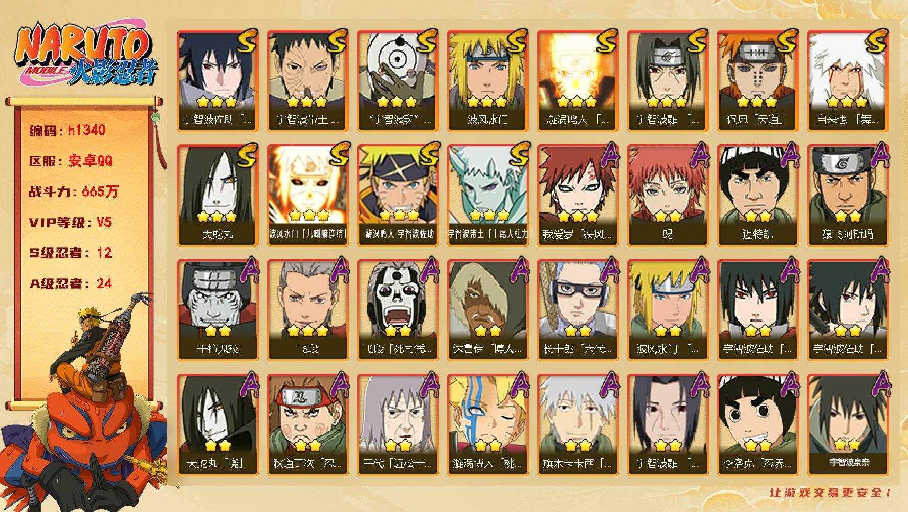 5S忍/15A忍/战力424W/V5/区服2163 【S忍者】宇智波佐助「漩涡鸣人」,自来也「舞之豪杰」,宇智波斑「秽土转生」,宇智波鼬「须佐能乎」,波风水门「九喇
