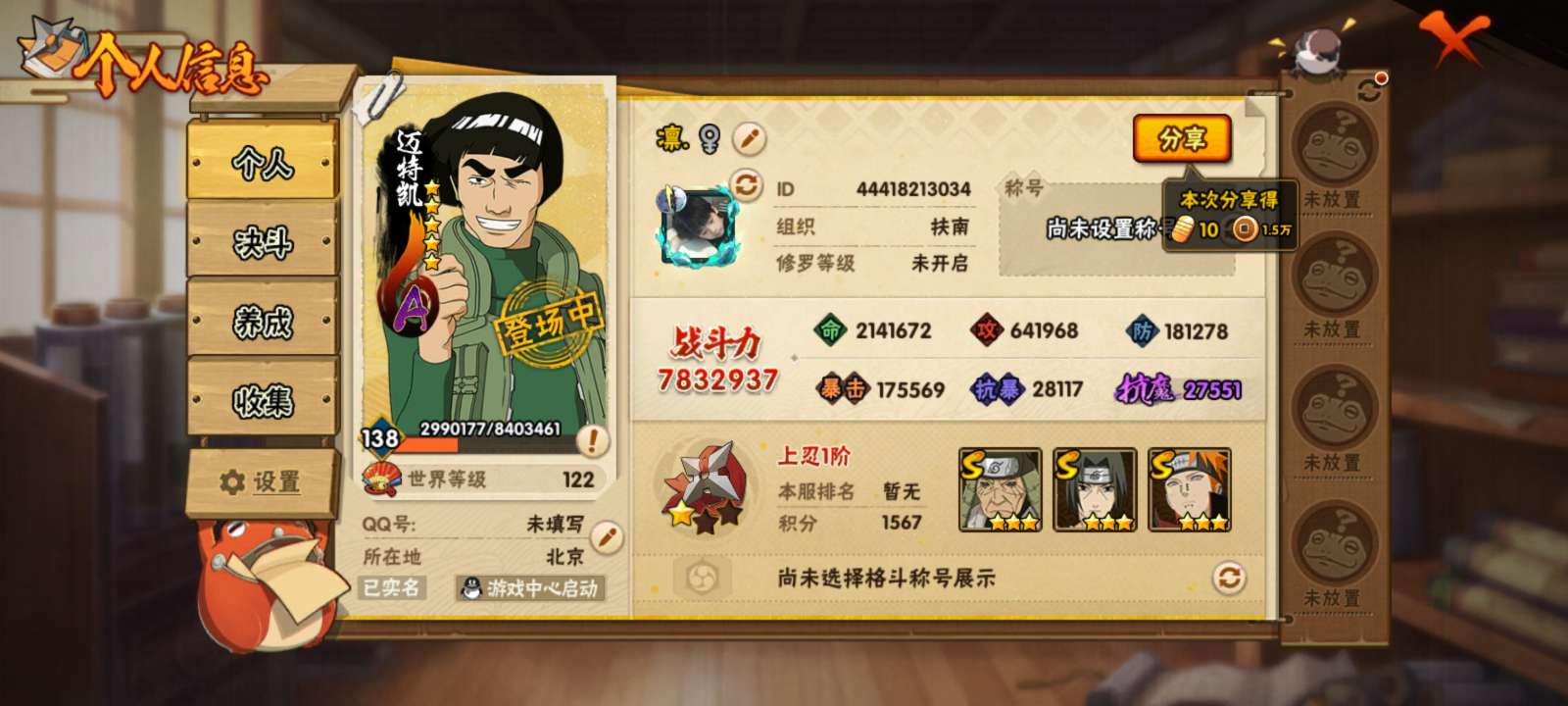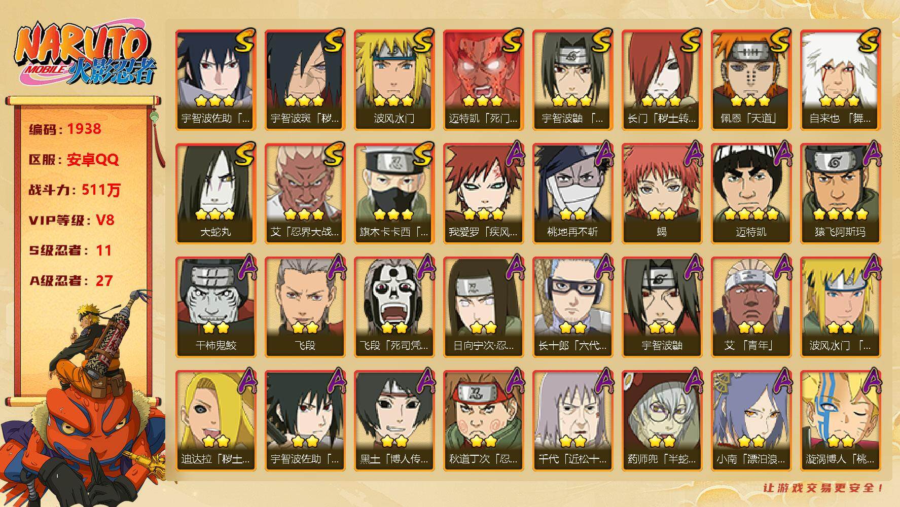 V8 511万战力 11S级忍者数-27A级忍者数 木叶创立斑50片 忍战大野