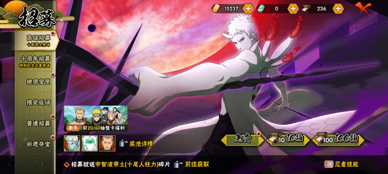 金币和高招卷可以抽十尾带土 基础忍者都有,限时点券没花,和平声望10