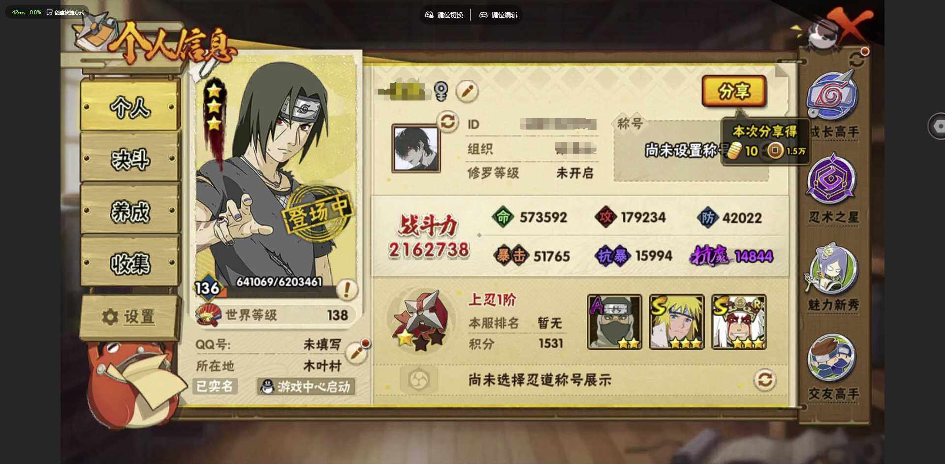 角色等级110 金币1500 战斗力270万 S忍4 A忍12 5星S忍者3 4 段位暗部