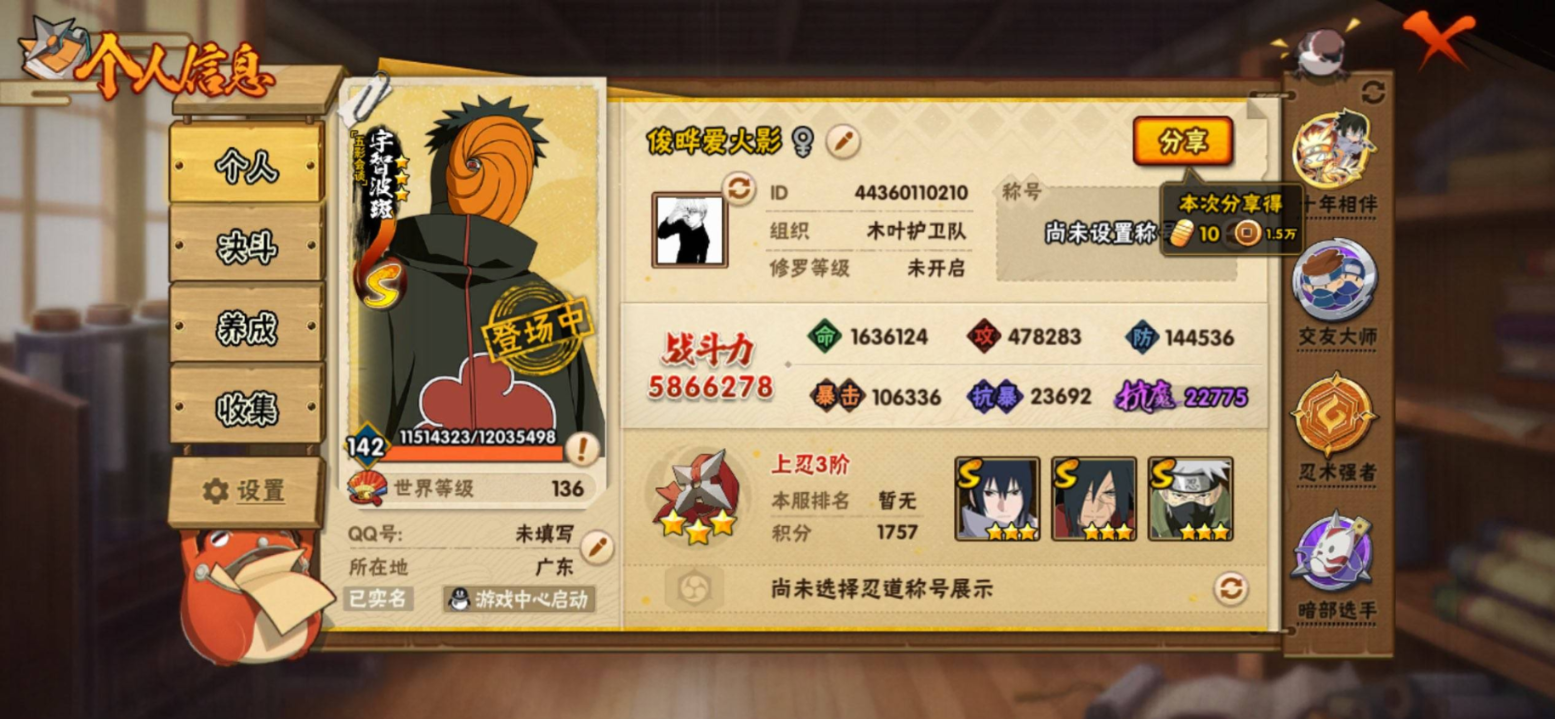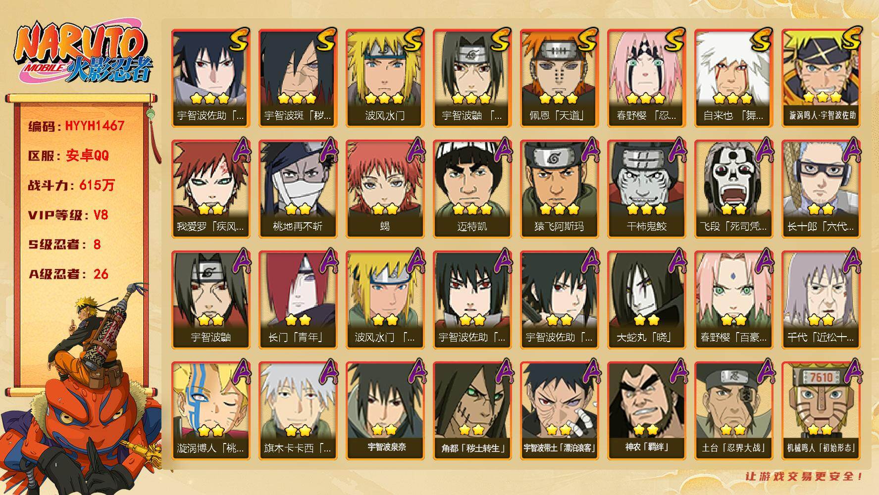 V8/战力615W/S忍8/A忍26/2星宇智波带土「漂泊浪
