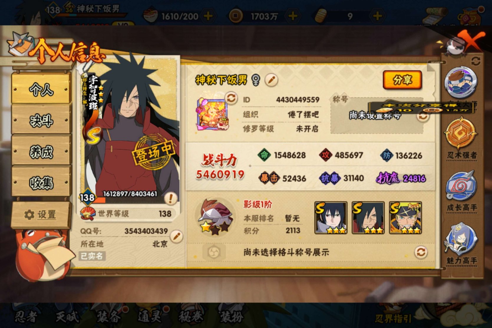 安卓QQ-可二次-V10-700万战力-S忍者数:13-