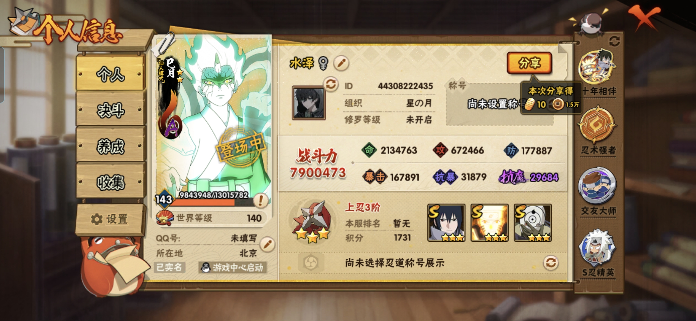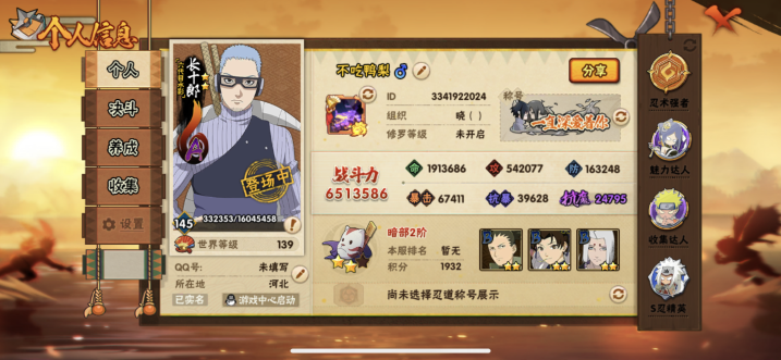角色等级145 金币7411 战斗力8489905 S忍25 A忍42 11