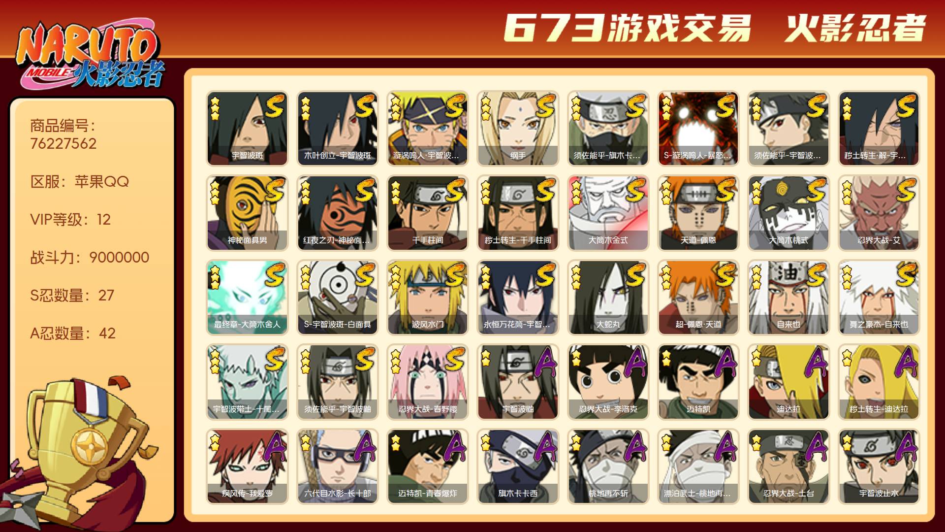 v9,987w战力,21S级忍者数-43A级忍者数,自来也60片,十尾带土50