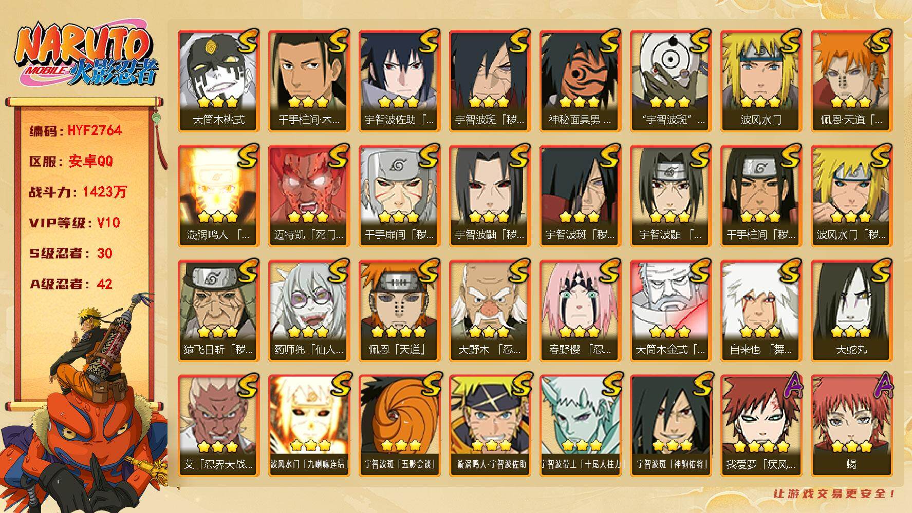 VIP等级V10/战力1423W/S忍数量30/A忍数量42/
