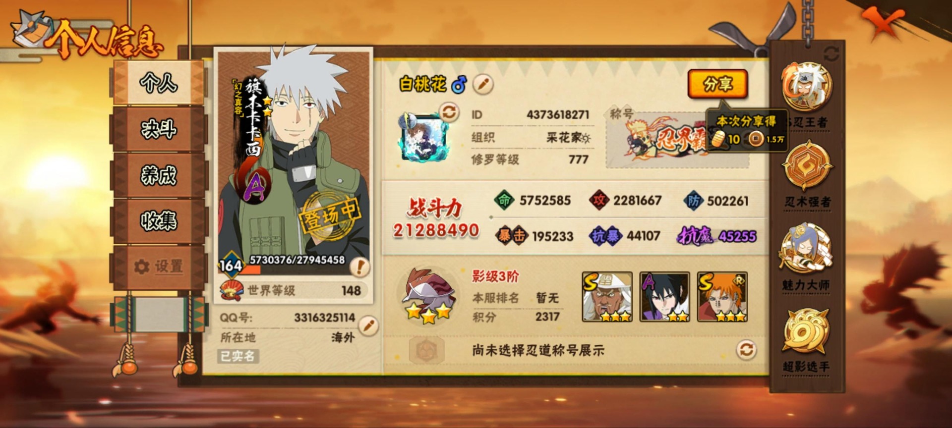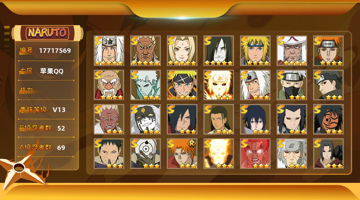 角色等级163 金币20000+ 战斗力2000+ S忍47 A忍68 5星S忍者45 13 段位暗部