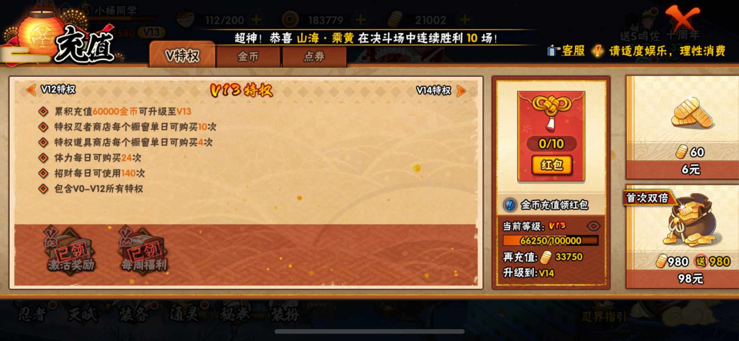角色等级123 金币132 战斗力123 S忍41 A忍61 5星S忍者123 1 段位新生