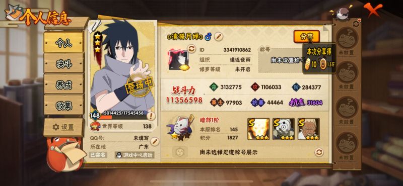 火影忍者【苹果QQ】IOS/32S忍/46A忍/战力1431W/V11/区服337 【S忍者】 宇智波止水「须佐能乎」,