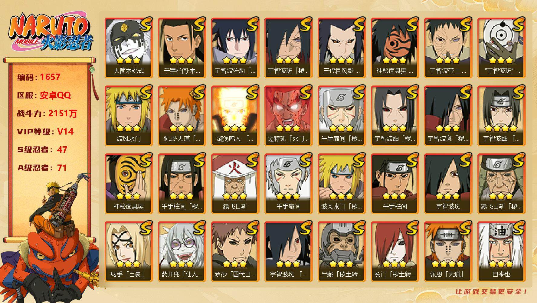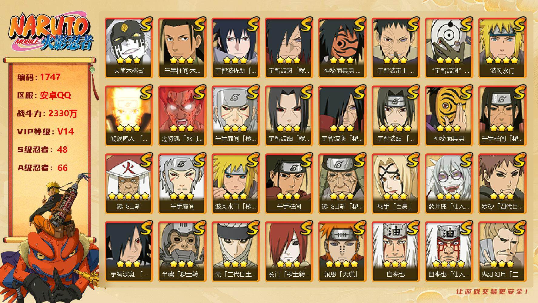火影忍者【安卓QQ】v14 48S 66A 2330w战力 主场景1个:木叶周年庆 热门A忍漂泊忍