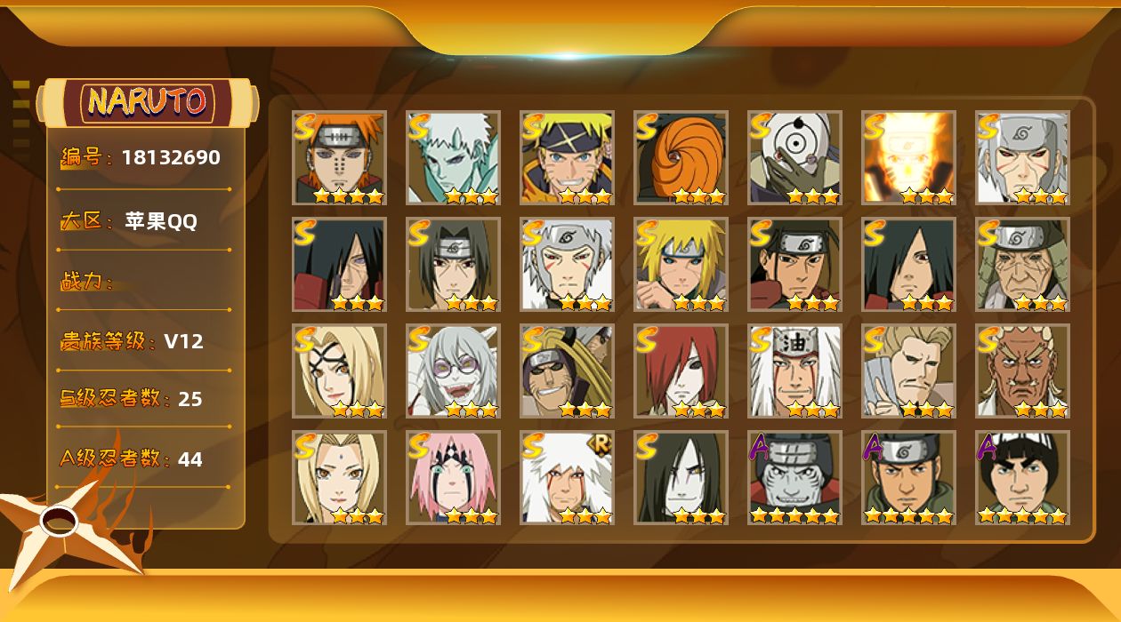 IOS/5S忍/8A忍/战力236W/V4/区服700 【S忍者】宇智波佐助「漩涡鸣人」,自来也「舞之豪杰」,旗木卡卡西「须佐能乎」,佩恩「天道」,波风水门, 【A忍者】