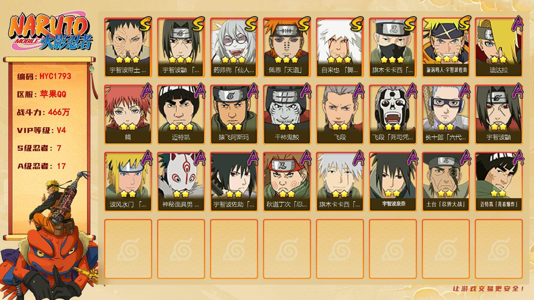 【HYC1793】V4/战力466W/S忍7/A忍17/3星自来也「舞之豪杰」