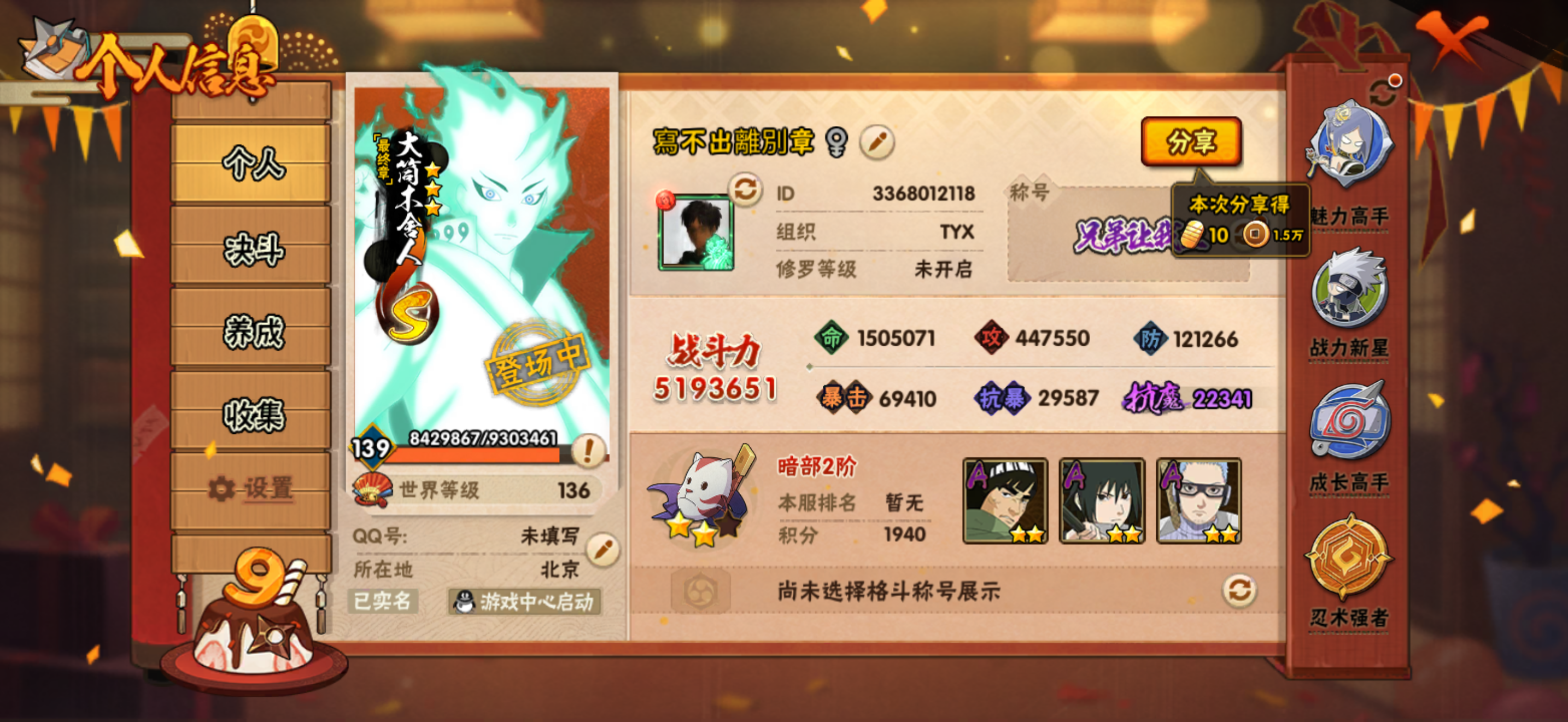 629W战力白面永恒佐助11S+鸡翅36A战力629忍者总数