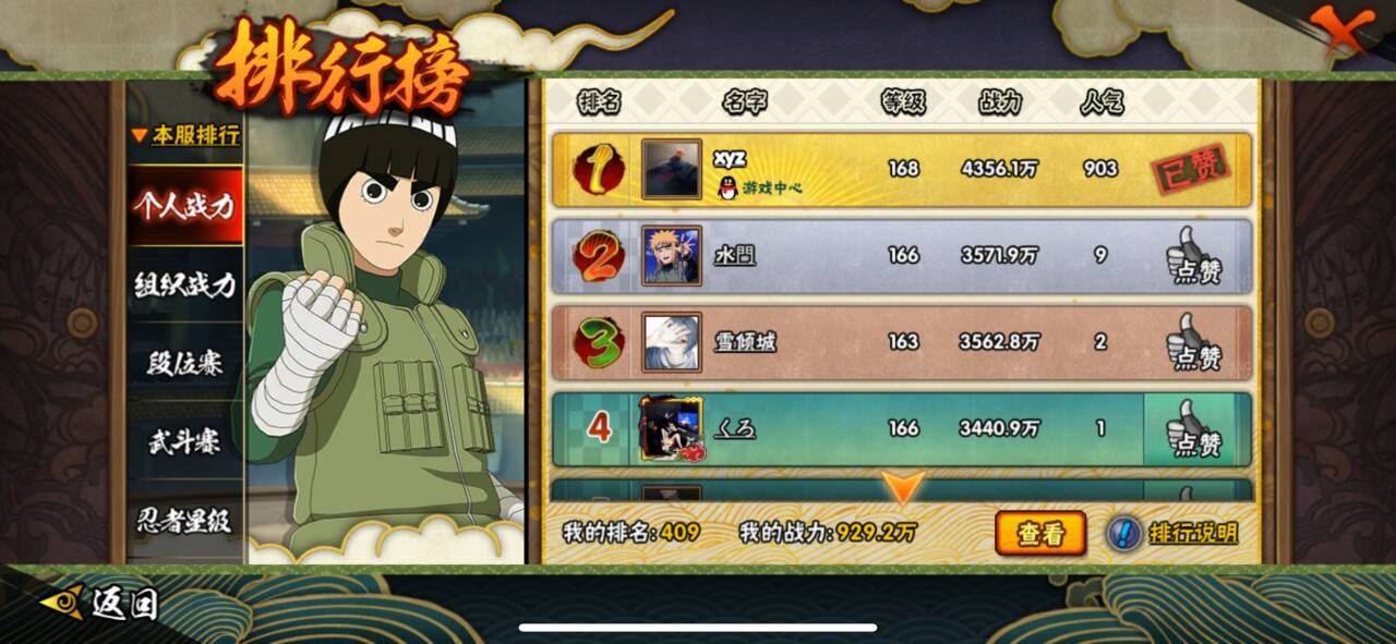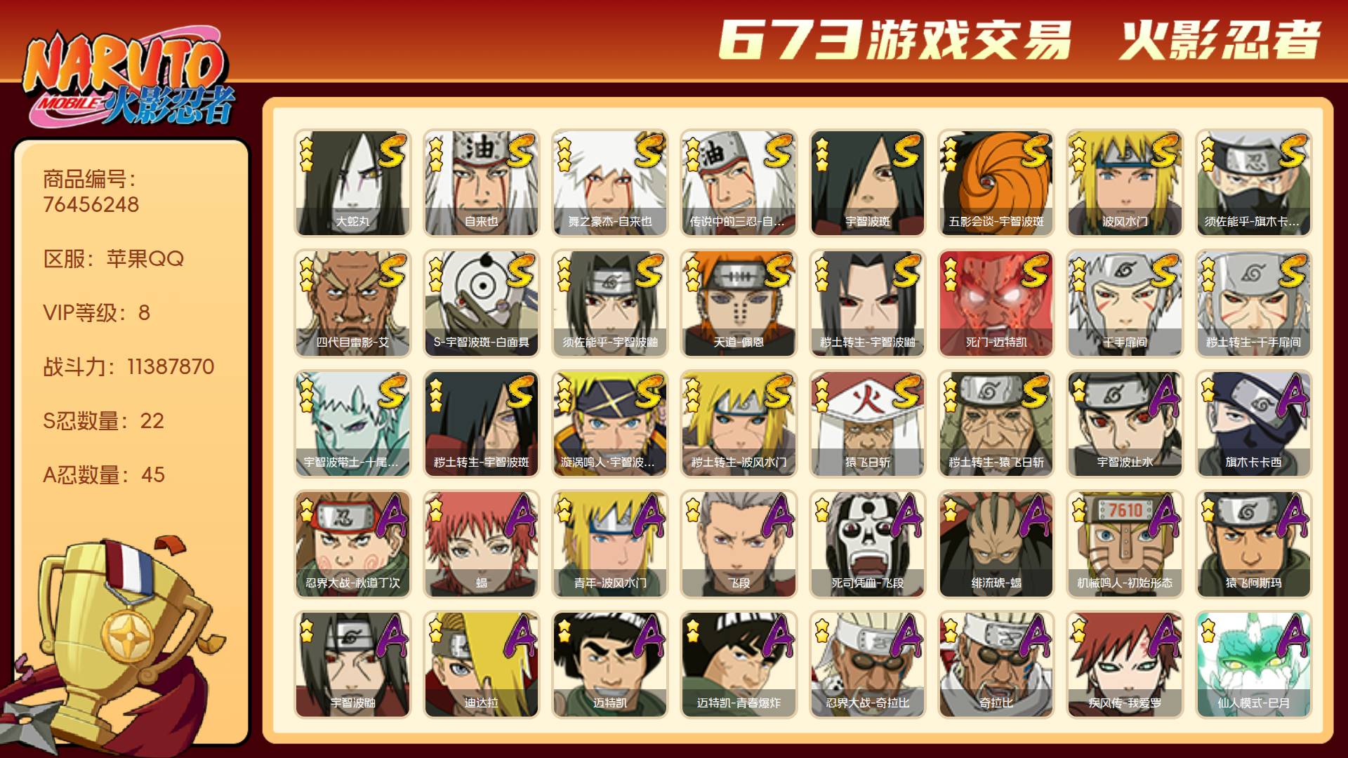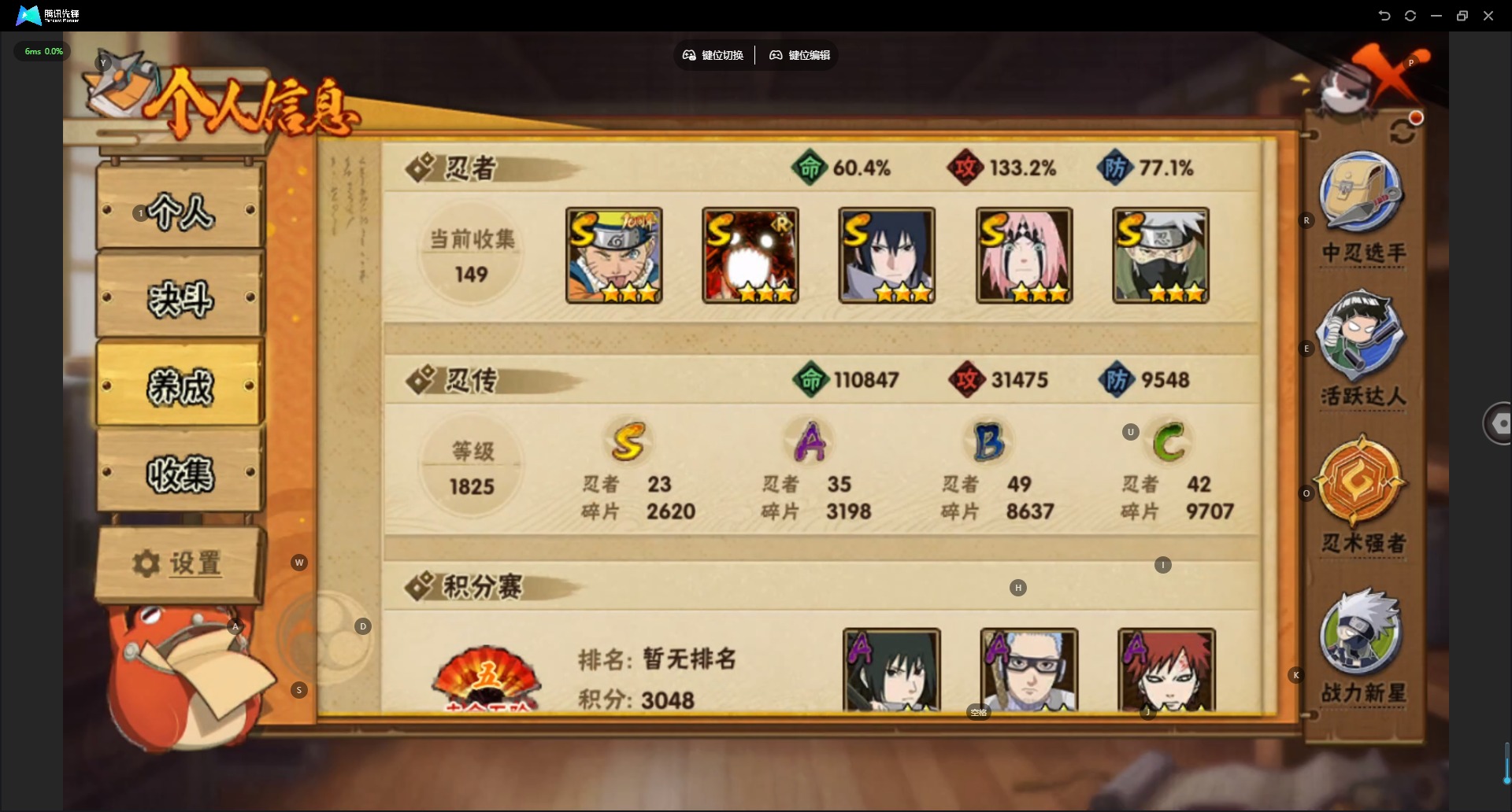 角色等级150 金币80 战斗力11387870 S忍22 A忍45 5星S忍者20 8 段位中忍