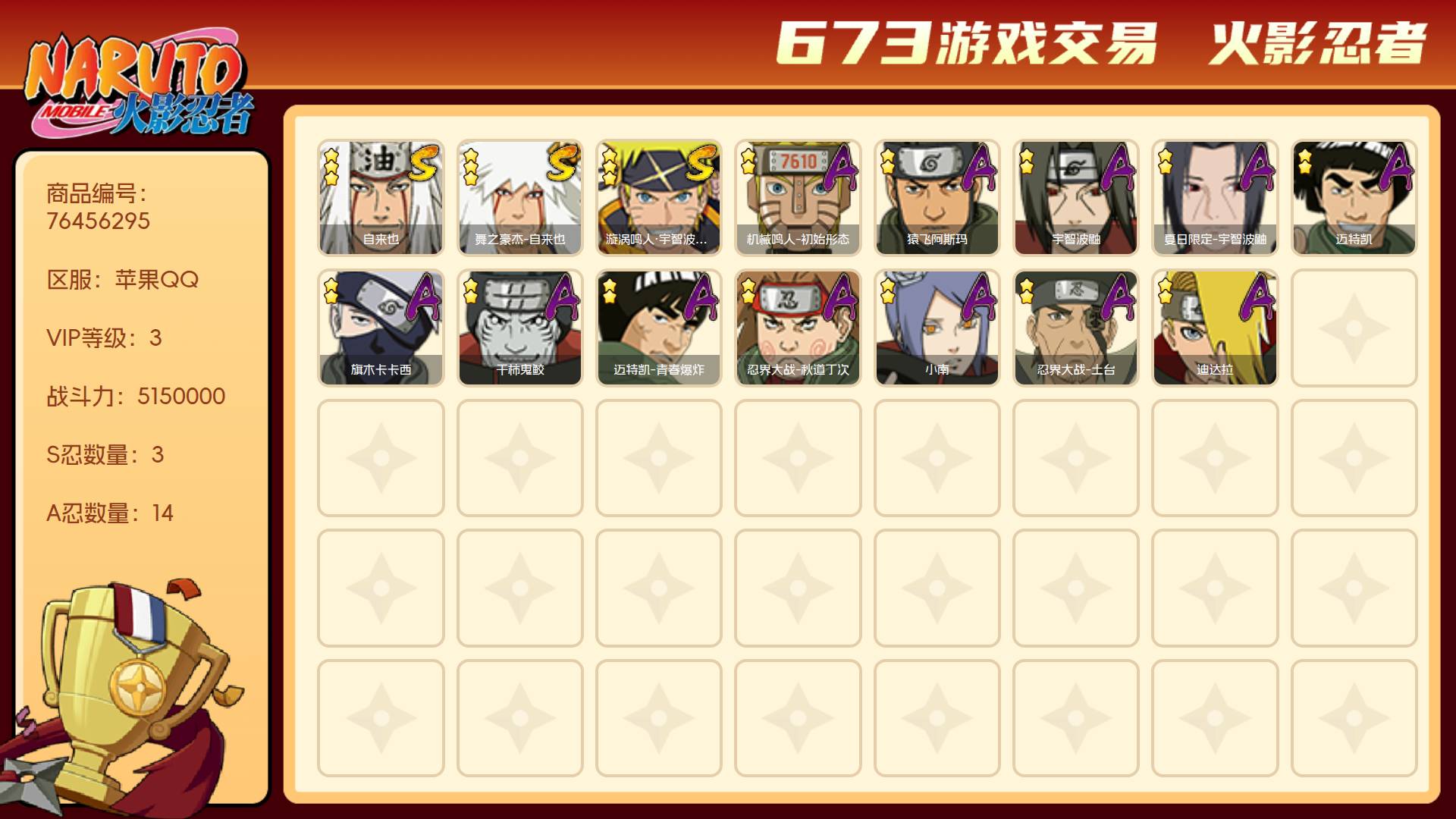 角色等级123 金币300 战斗力5150000 S忍3 A忍14 5星S忍者2 3 段位下忍
