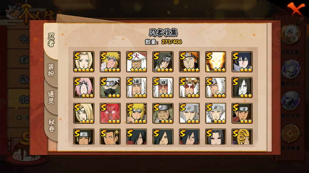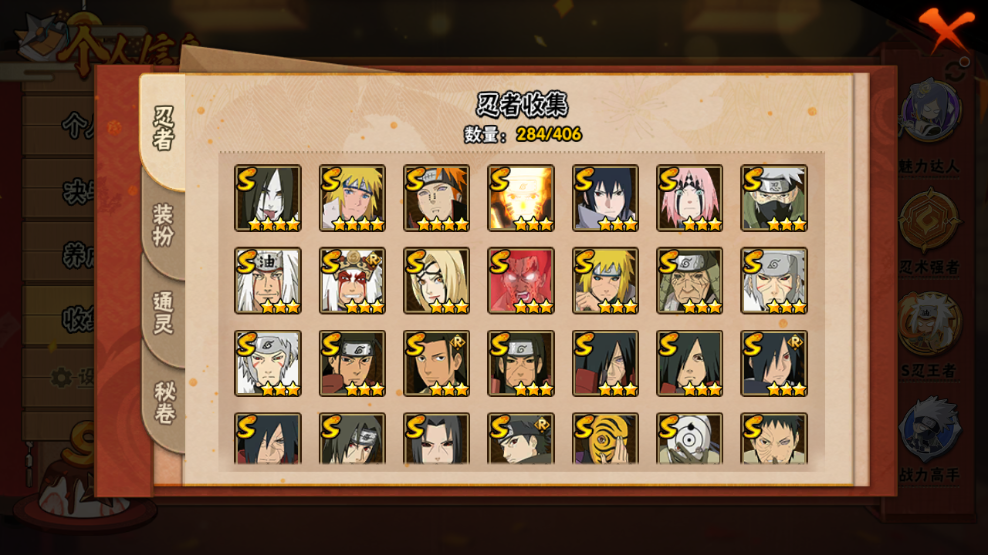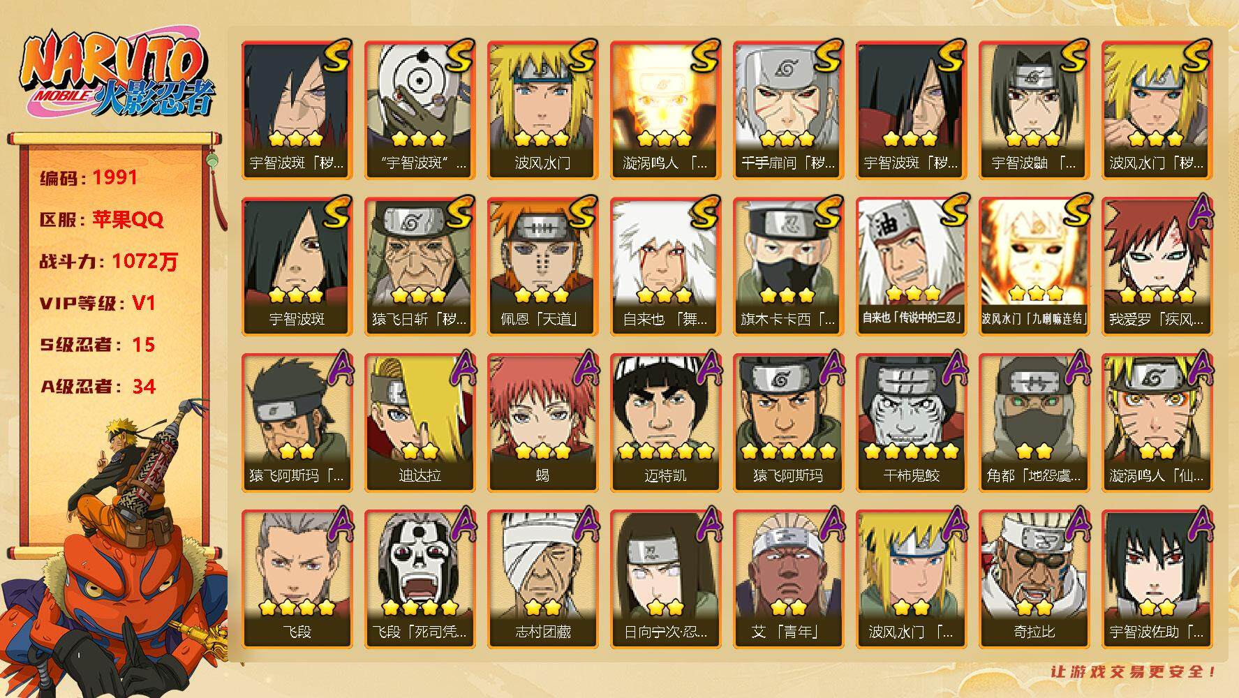 火影忍者【苹果QQ】v1,1072w战力,15S级忍者数-34A级忍者数,大蛇丸62片,纲手72片