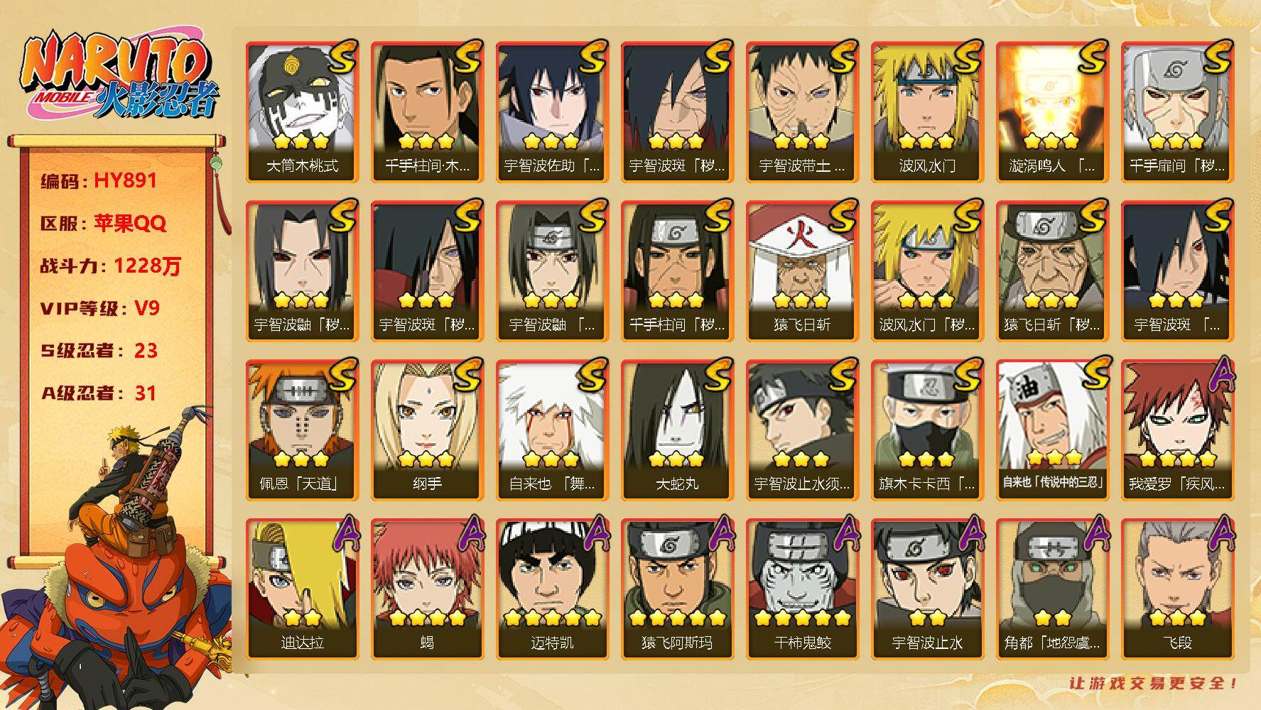 火影忍者【苹果QQ】V9/1228万战力/总忍者185/23S/31A/须佐止水/创立柱间/创立斑